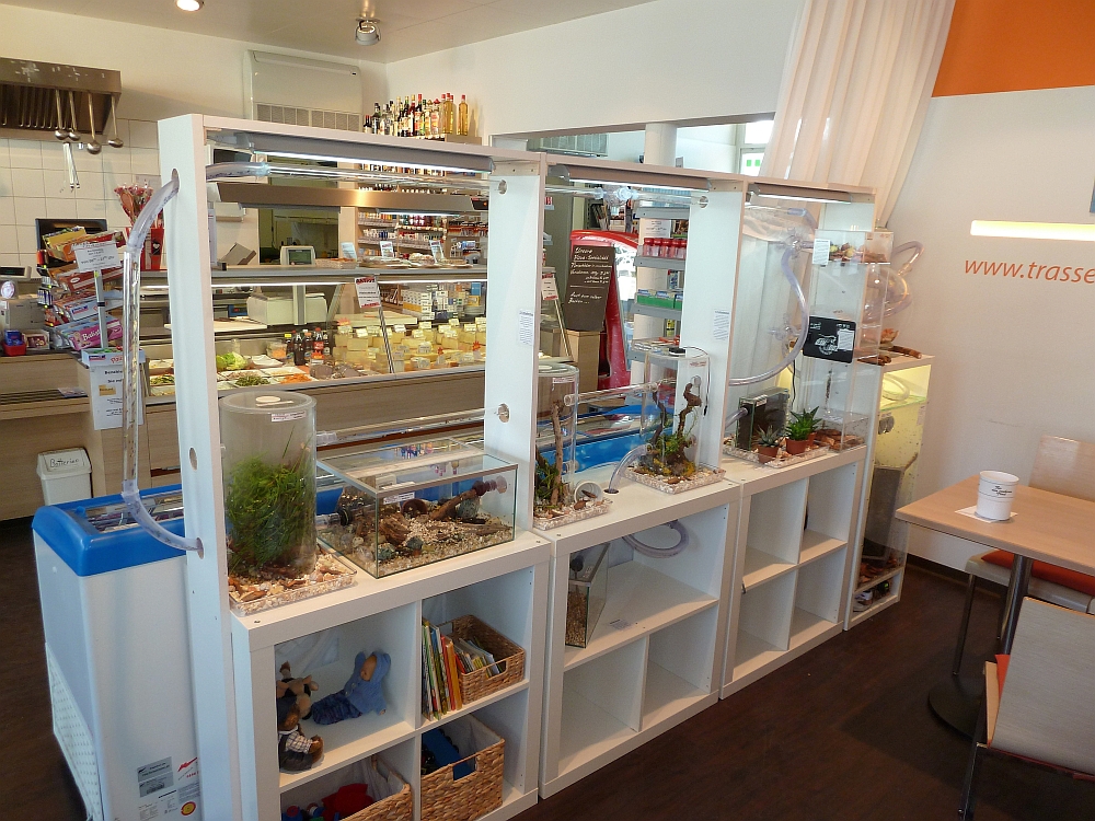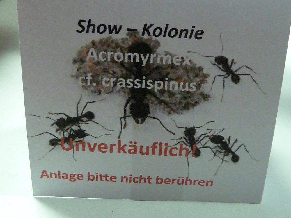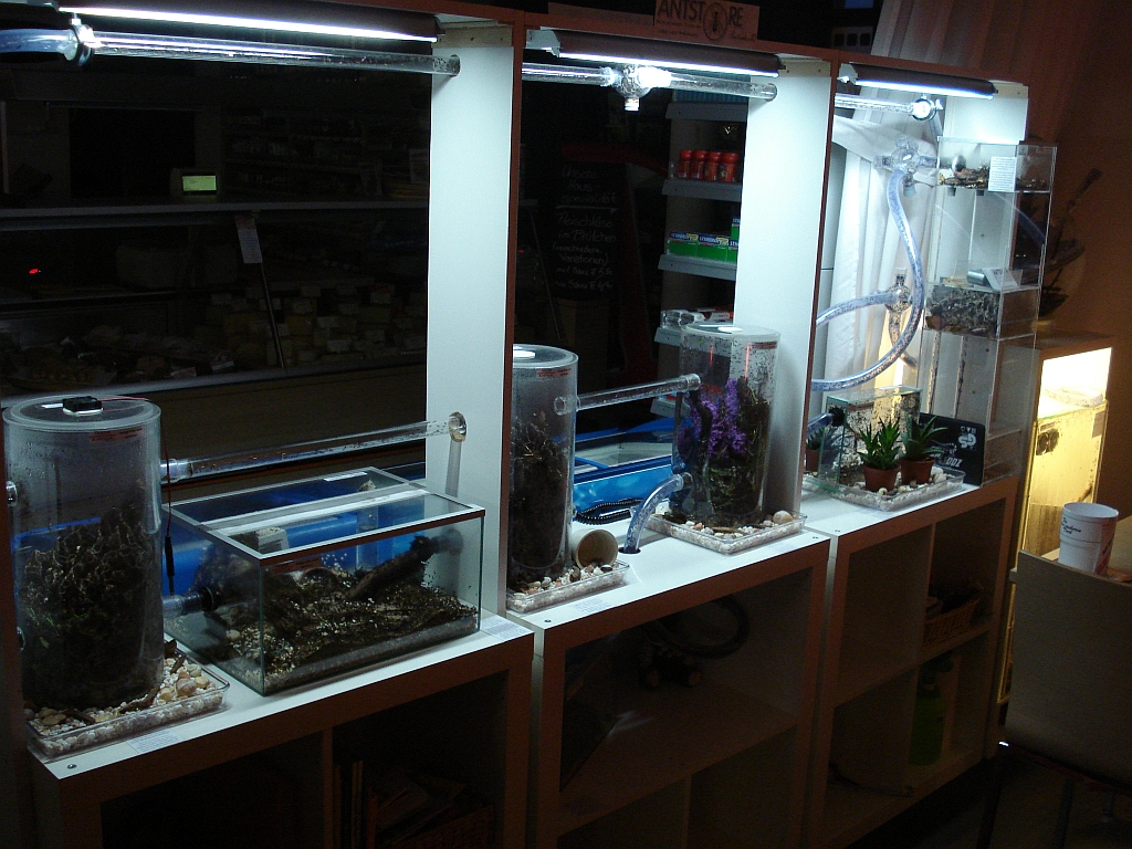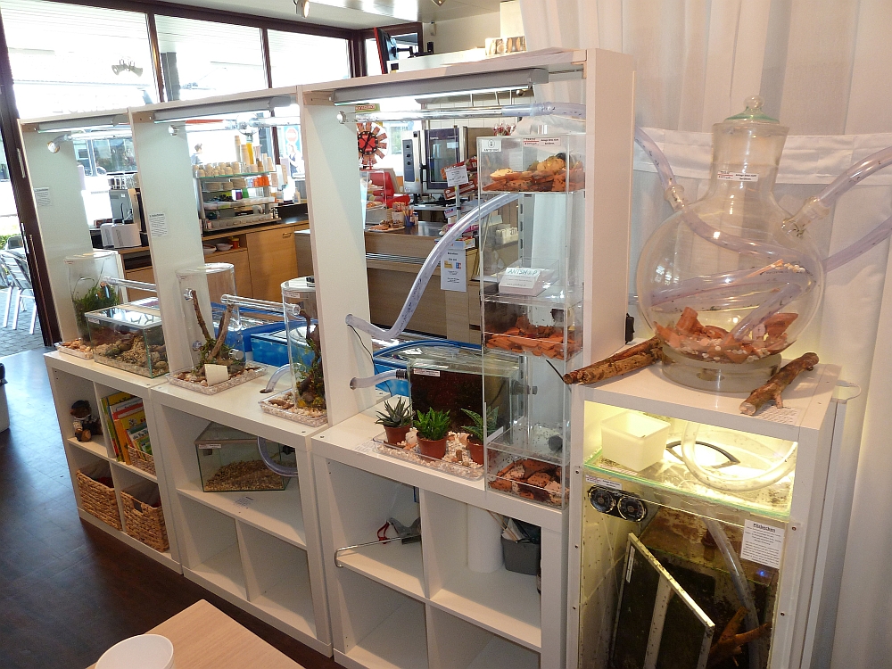 Damit auch alle was zum gucken haben, steht eine schöne Acromyrmex - Kolonie im Geschäft. Nicht nur Ameisen - Fans sind begeistert und schauen denKlienen "Rackern" stundenlang zu. Schlussendlich sind auch diese vom Ameisenfieber angesteckt. Gerne erklären wir den Interessierten die Funktionen der Becken und erläutern die Haltung genauer.
