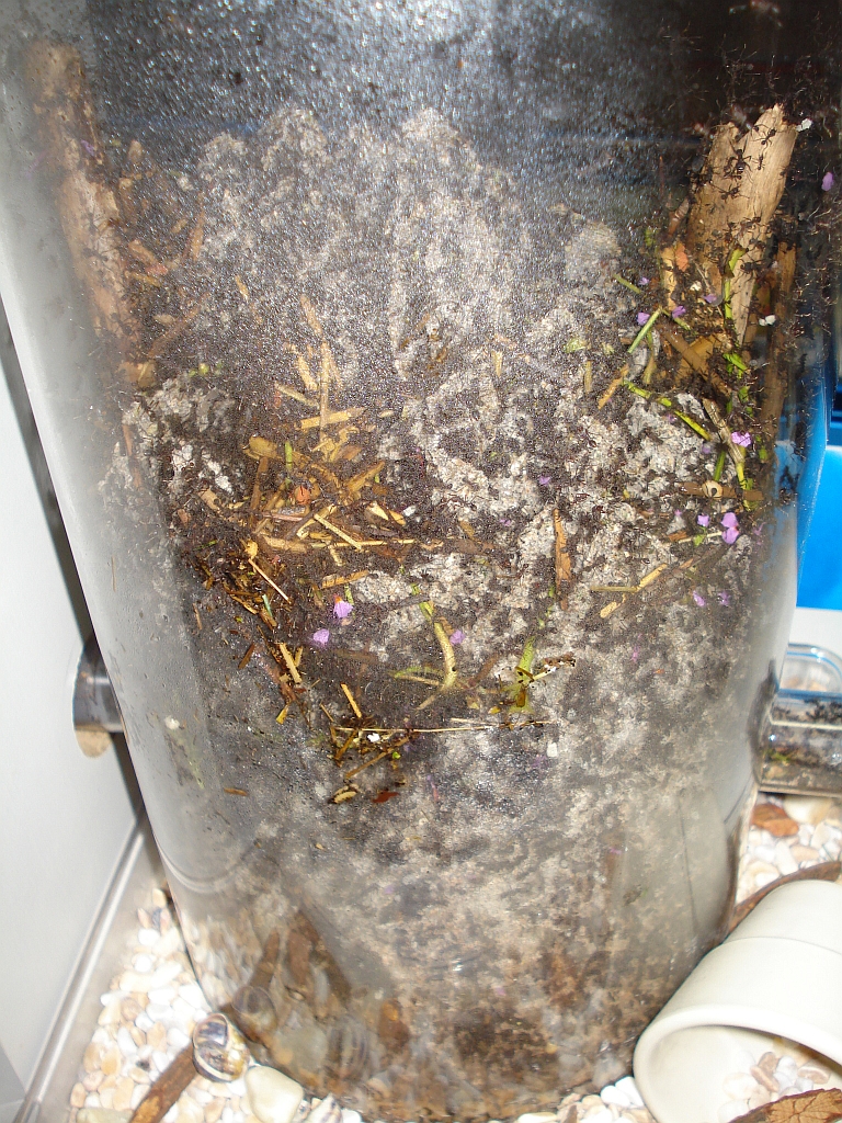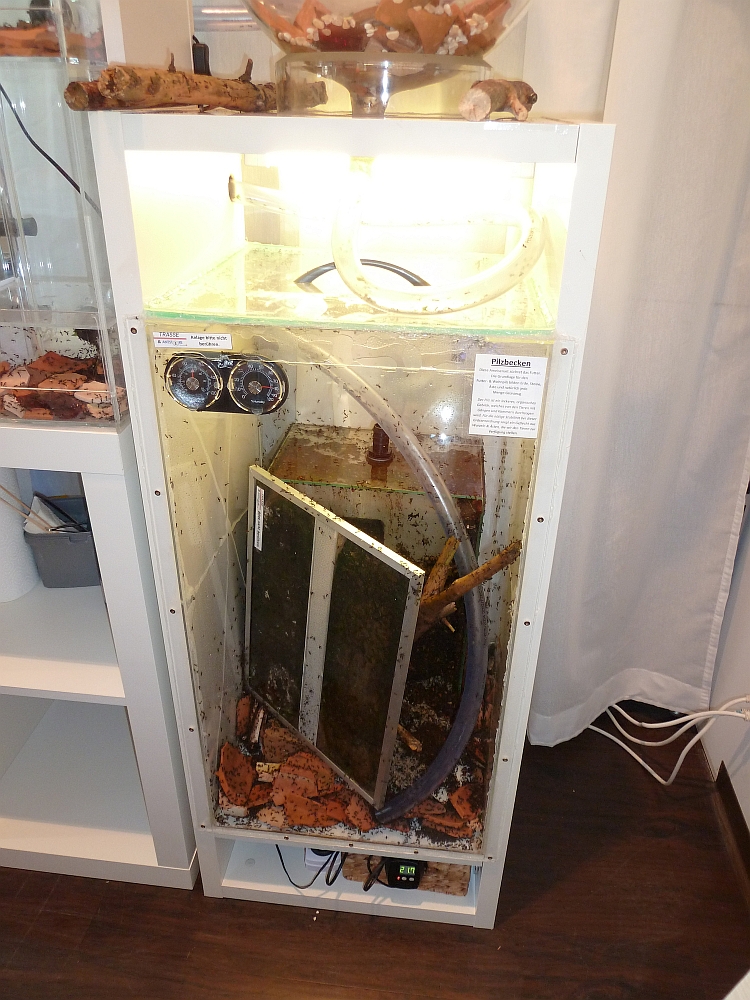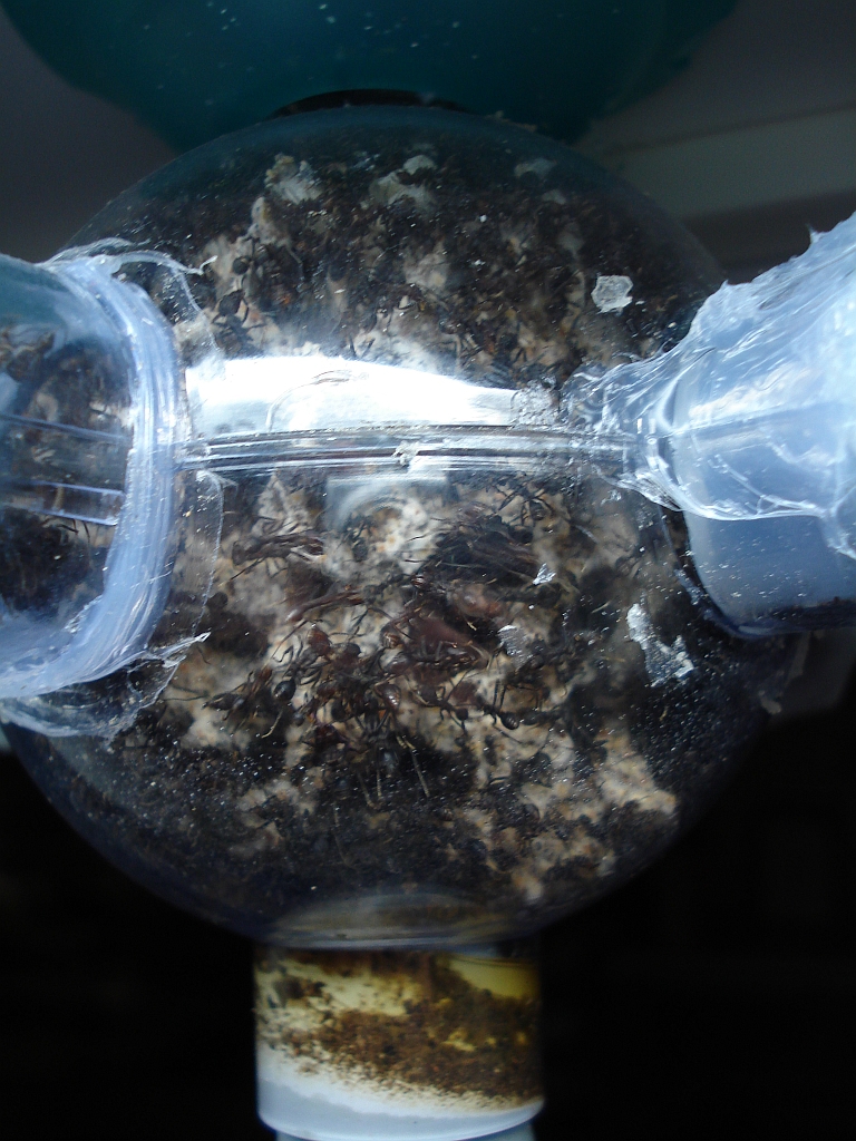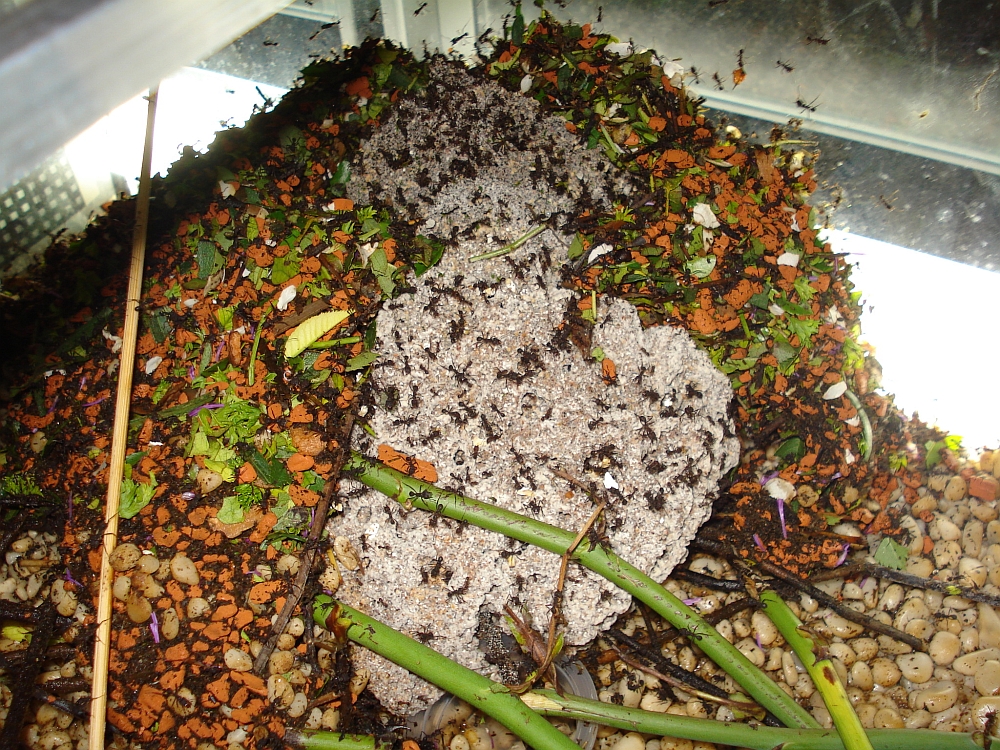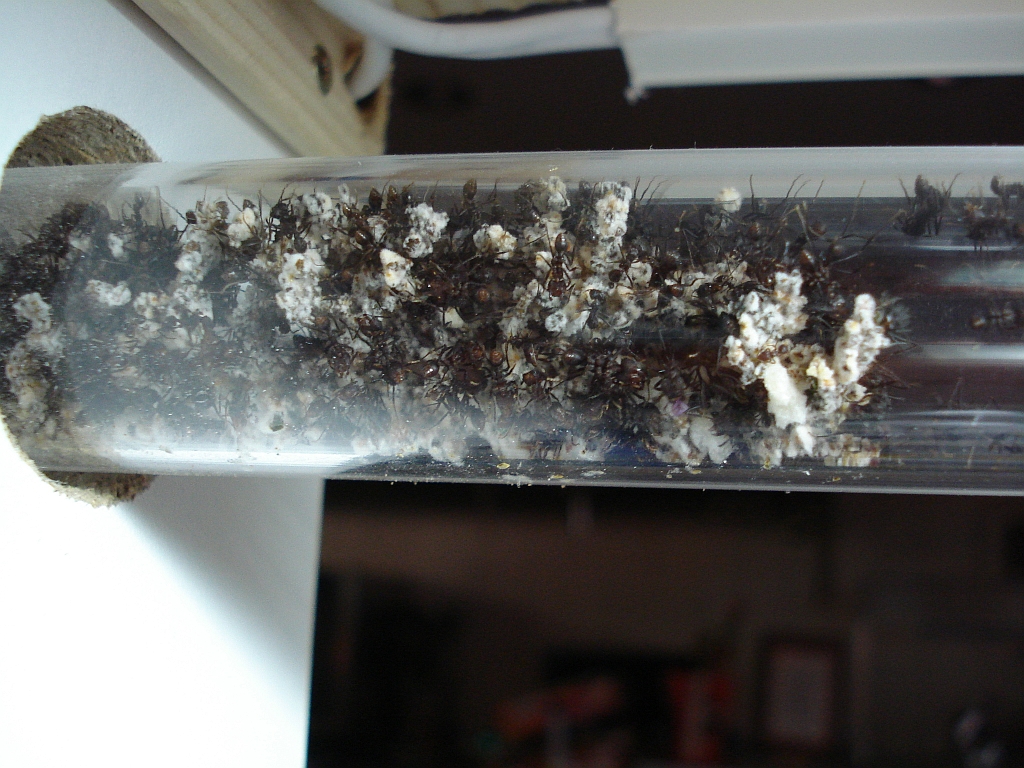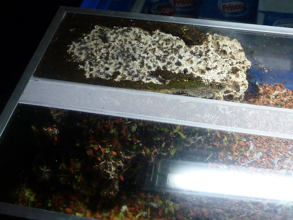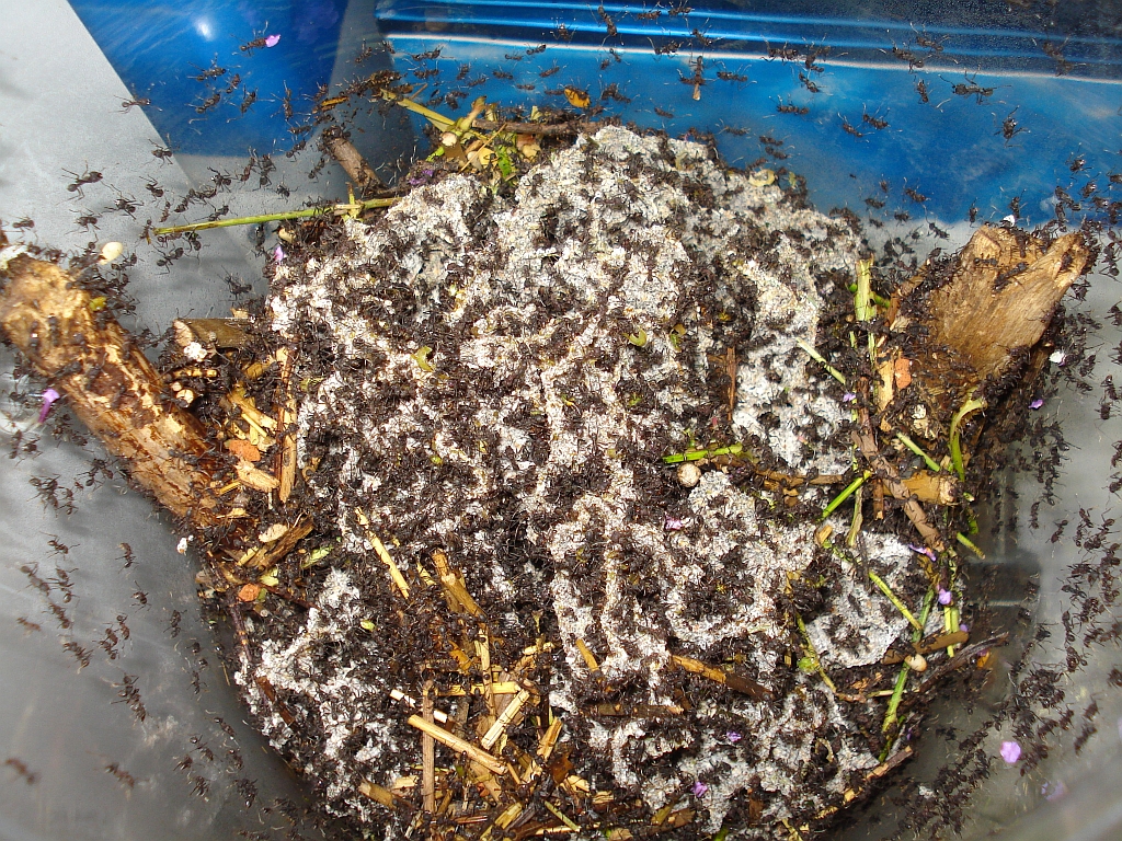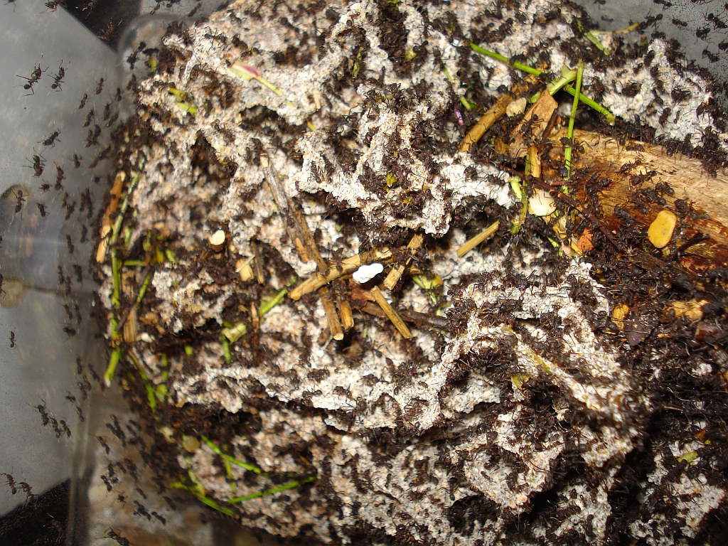 Der Kolonie geht es blendend, fast zu gut. Sprunghafter Anstieg der kleinen Bewohner ist zu beobachten. Brut wird massig bewegt (mitlerweile haben wir verschiedene Wärme- und Feuchtigkeitszonen hinbekommen). Überall, wo es passt wird Pilz angebaut (wir müssen da mal wieder etwas Ordnung schaffen).