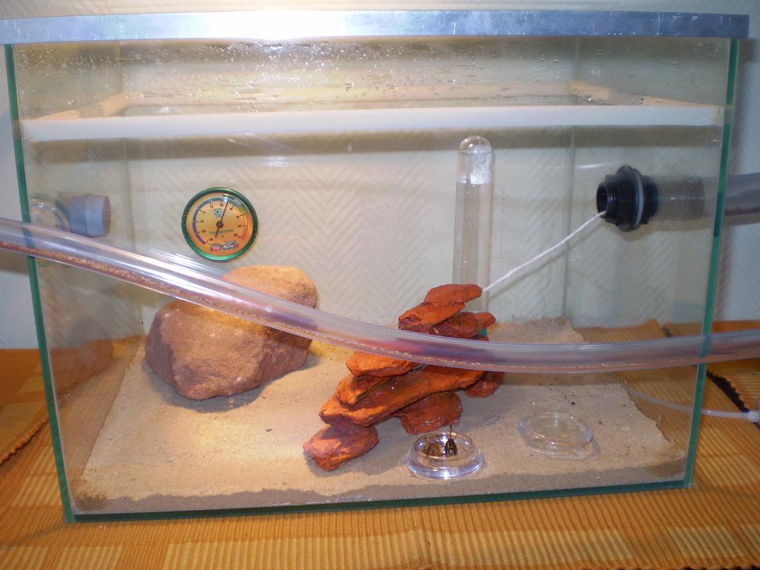 Arena: Glasbecken mit Deckel, Boden mit ausgehärtetem Sand-Lehm.