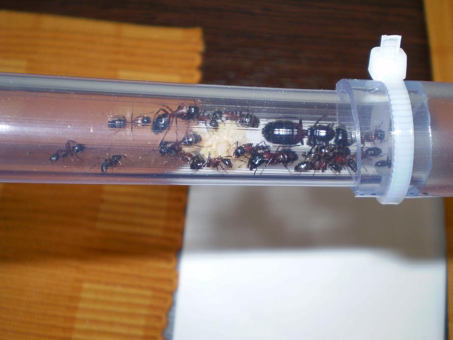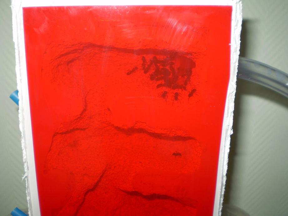 Besonders in der Nacht haben sie sich allerdings bereits dazu entschlossen ihren Eingang aus dem Reagenzglas zu sichern und haben einen beachtlichen Sandhaufen angelegt. Sollte sich tagsüber eine Ameise im Aussenbereich aufhalten ist mir aufgefallen das sie sehr vorsichtig vorgehen und schreckhaft reagieren. Das mag vielleicht an der noch kleinen Koloniegröße liegen: