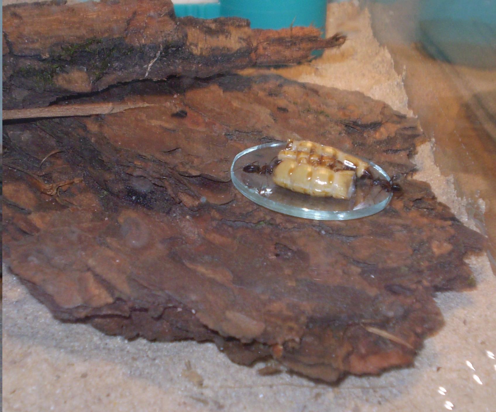 Zuckerwasser und ein Insekt liegen immer frisch bereit, damit bei Bedarf etwas vorhanden ist.