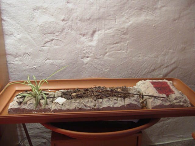 Das über 100cm lange Inselnest der großen Kolonie. Links ein Inselteil mit einer Pflanze und ziemlich offenem Gelände, in der Mitte ein großer Jagdteil mit Gehölz und Steinchen, ganz rechts schließlich ihr Nest, dass durch das Wasser im Graben und die Saugfähigkeit des Ytong immer feucht gehalten wird.