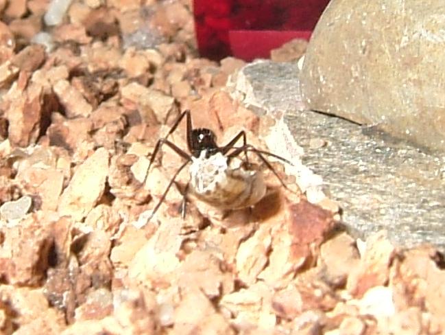 Sie hält sich noch dicht an der Gyne, muss aber schon mindestens etwa 2 Tage alt sein, da ihr Chitinpanzer bereits ausgefärbt war.
