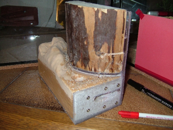 ); 2,5 im Holz und eine im Ytong. Desweiteren eine einsehbaren Wassertank. Die Kammer im Ytong, die komplett mit Kies aufgefüllt ist, habe ich so angelegt, daß ich nicht die gesamte Seite abdunkeln muss und so immer Einblick auf den Stein und dessen Färbung habe, woraus sich ja der Feuchtigkeitsgrad schließen lässt.