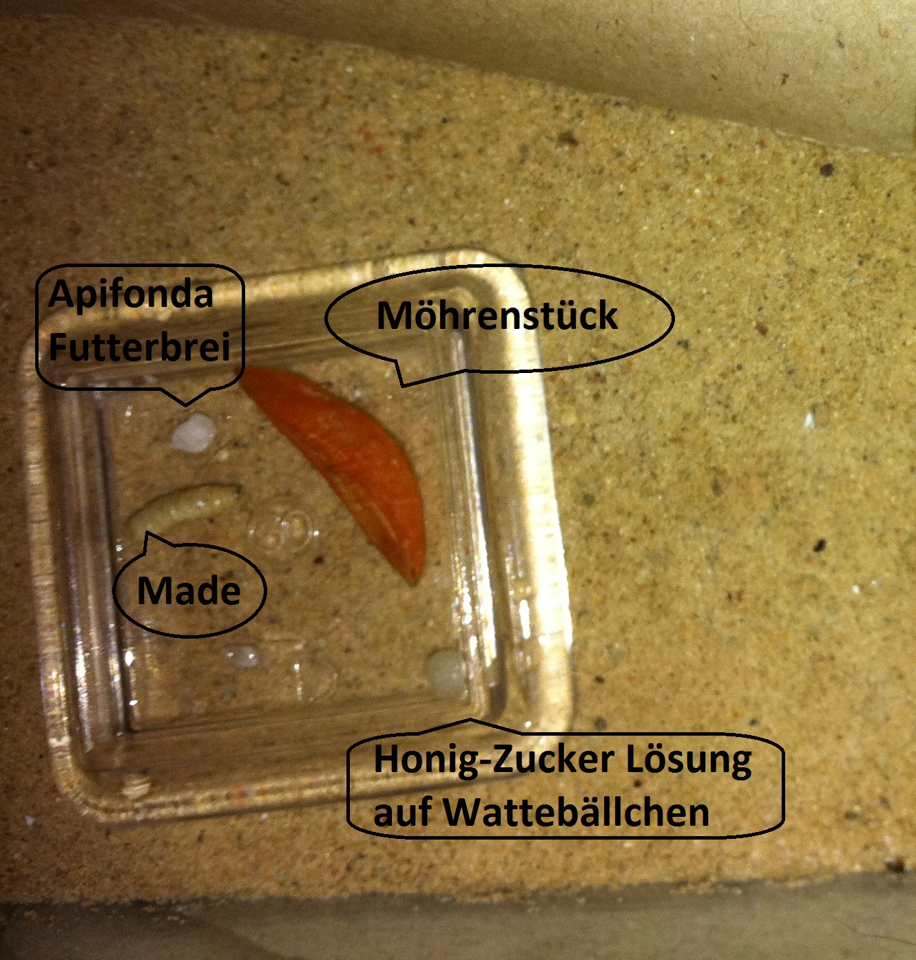 Und es gibt zu berichten das die Kleinen anscheinend auf Zuckerwasserhoniglösunggemisch stehen. Ich gebe immer Zuckerwasser auf die Watte und oben drauf Honig. Und sehr oft wenn ich rein schaue ist eine Ameise am Watteballen.