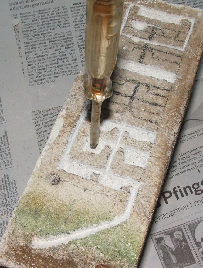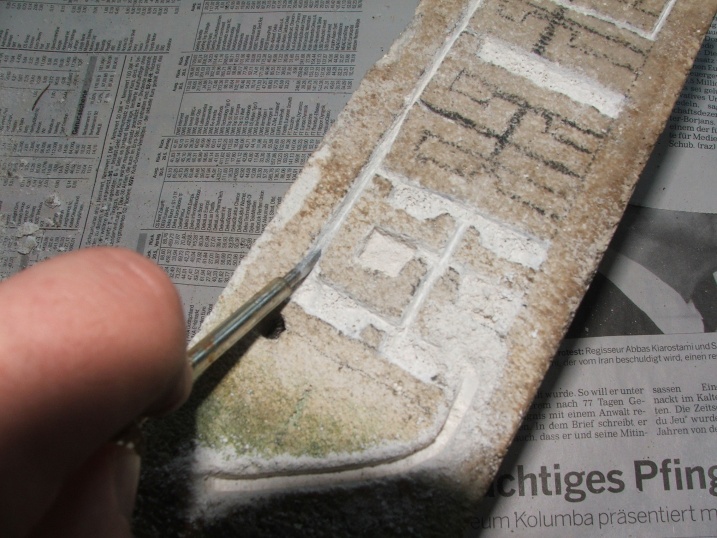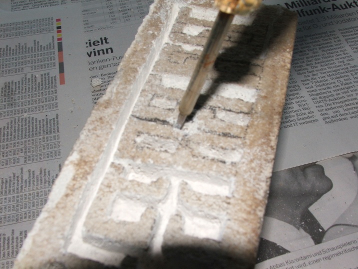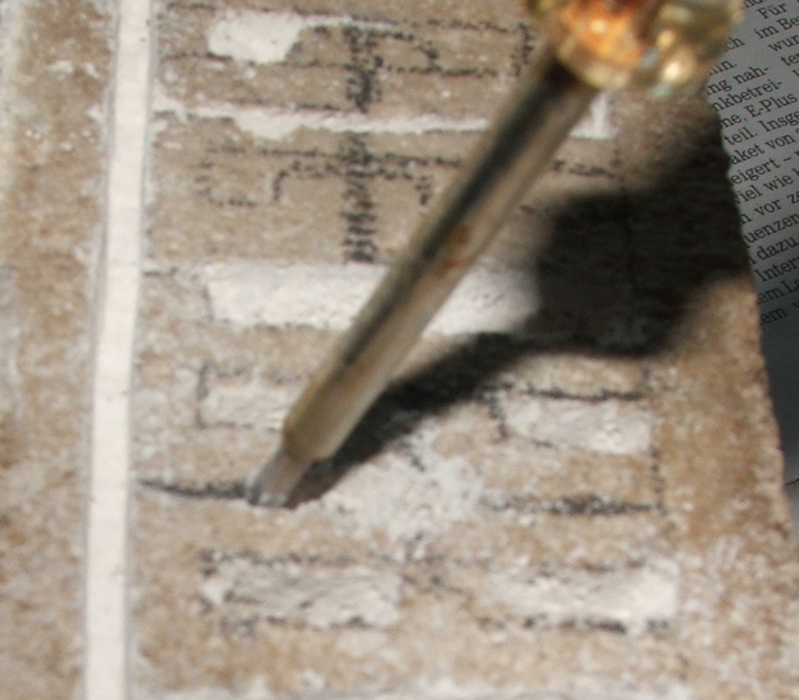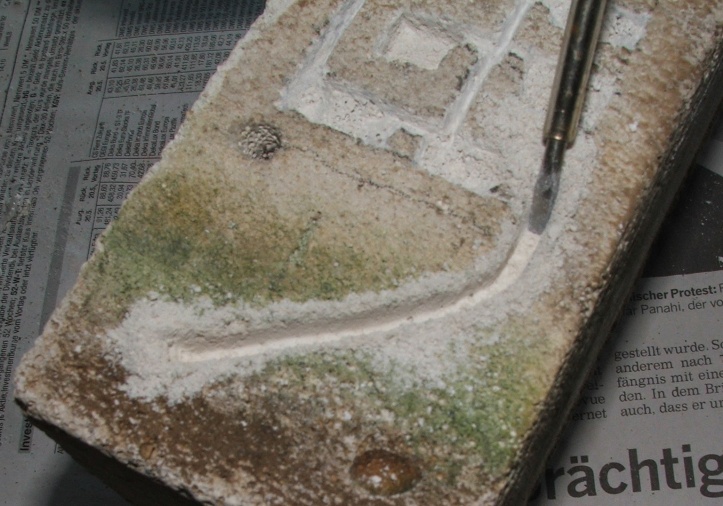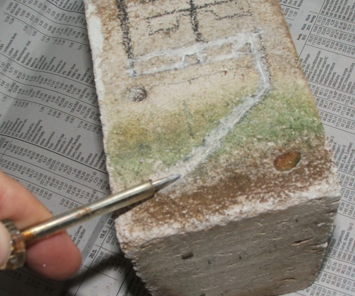 Diese Ritze ist deswegen so wichtig, weil sie im nächsten Arbeitsschritt die Form der Kammer oder des Ganges vorgibt, sie muss tief sein, oder man bricht über sie hinaus Material ab (ein Milimeter oder eineinhalb müssten reichen)!