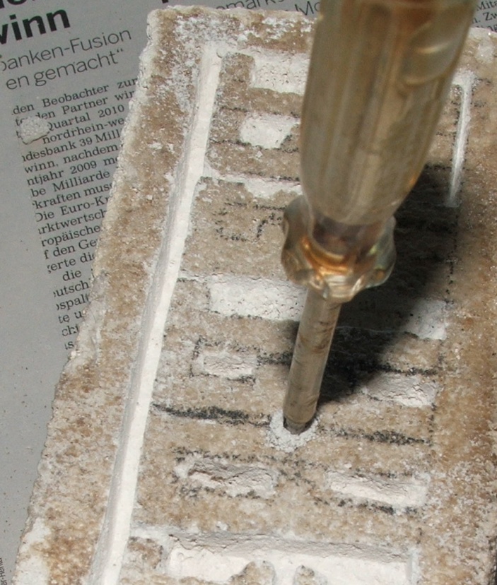 man drückt den Schraubenzieher knapp daneben (ein bis eineinhalb mm) in den Ytong und drückt dabei leicht in Richtung des Loches, so erweitert man das Loch Stück für Stück, bis es die gewünschte Größe hat, dabei feilt man auf ähnliche Art und Weise die Wände der Kammern glatt.