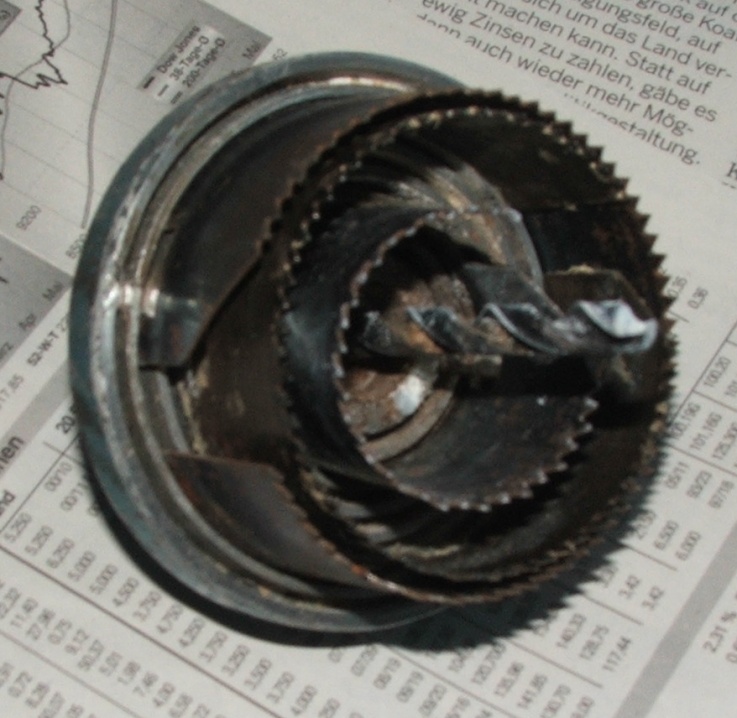 Man kann auch einen Bohrkopf nehmen, zuvor sollte man jedoch schon die richtige Richtung durch eine Ritze angegeben haben, um nicht zu viel nachkorrigieren zu müssen! (Bild sechs)