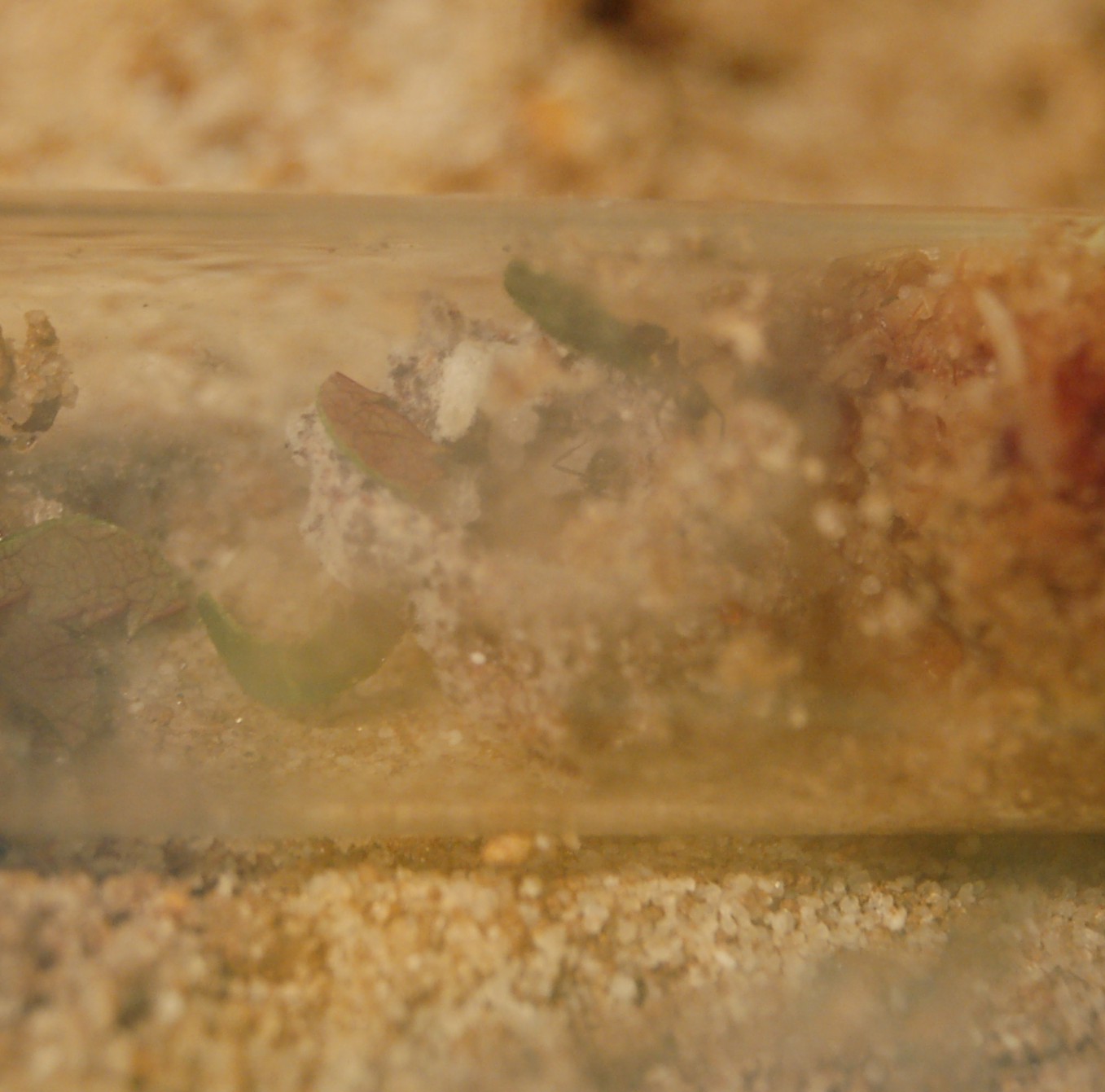 Die Kolonie ist auf ca. 12 Arbeiter herangewachsen. Brut gibts reichlich und auch der Pilz ist auf fast 4 cm herangewachsen. Zur Zeit verschlingt die Kolonie 1 1/2 Basilikum blätter pro Tag.