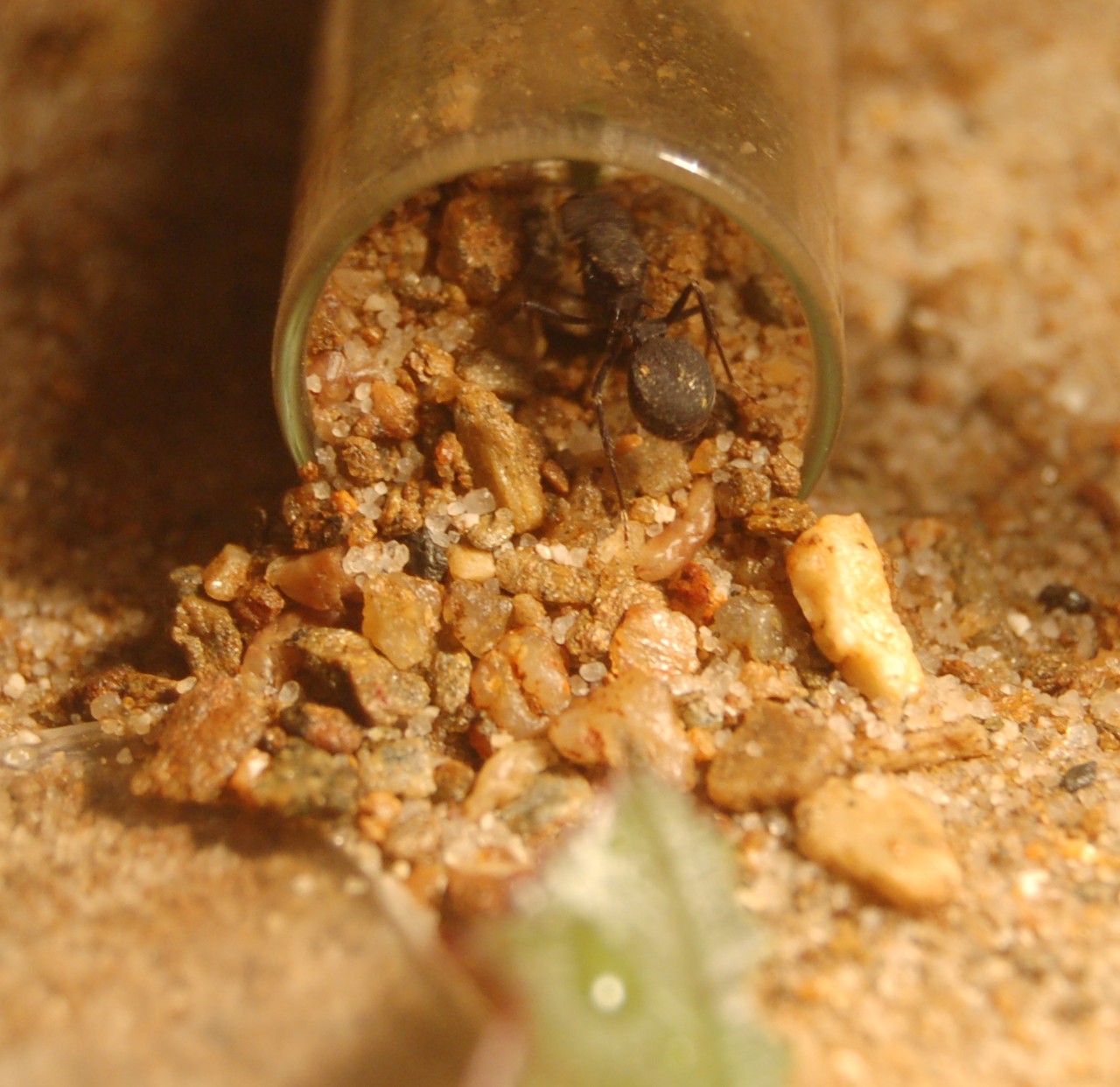 Ich habe mich entschieden die Königin selbst entscheiden zu lassen wo sie am liebsten gründet. Also habe ich das Reagenzglas in dem sie ankam einfach in eine dunkle Ecke im Terrarium gelegt. Die Königin ist bis heute im Reagenzglas geblieben. Ich war auch erstaunt über die fleisigkeit und über die Kraft die diese Königin besitzt da sie fast das komplette Reagenzglas bis oben hin zugegraben hat und nur einen dünnen Gang für sich selbst übrig gelassen hat. Dabei hob sie sehr dicke Brocken hoch von denen ich überzeugt war dass sie sie nicht hochheben könne.