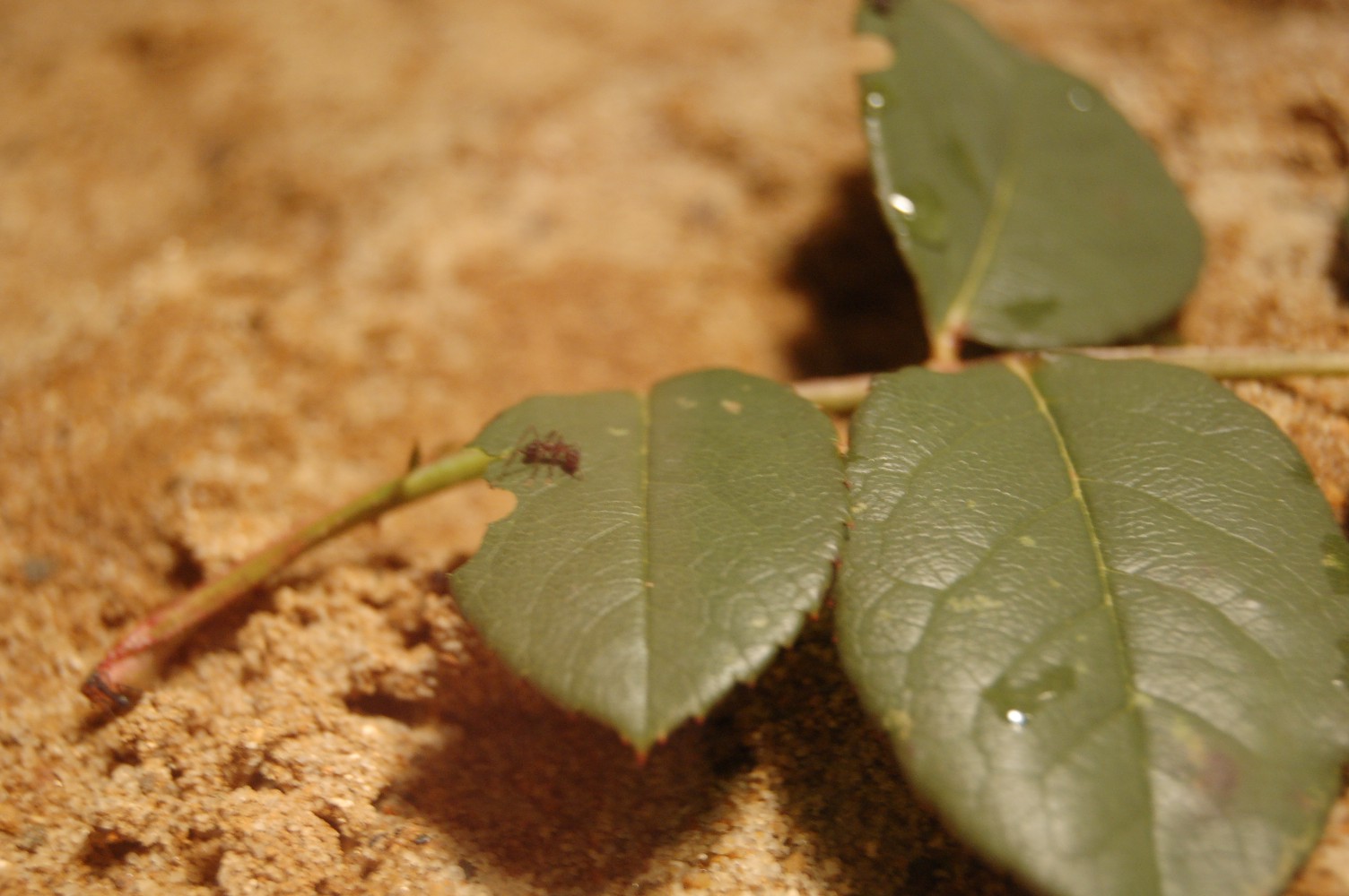 Diese Roseblätter werden von ihr liebendgern geschnitten. Noch lieber als das Blatt selbst wurde der Stängel des Blattes abgschnitten, zertrümmert und auf den Pilz geklebt. Später habe ich zwei Blätter 9 Tage im Terrarium gelassen, bis sie sich schon gelblich bis bräunlich verfärbten und ich habe festgestellt, dass die Schneideaktivität noch umso größer ist.