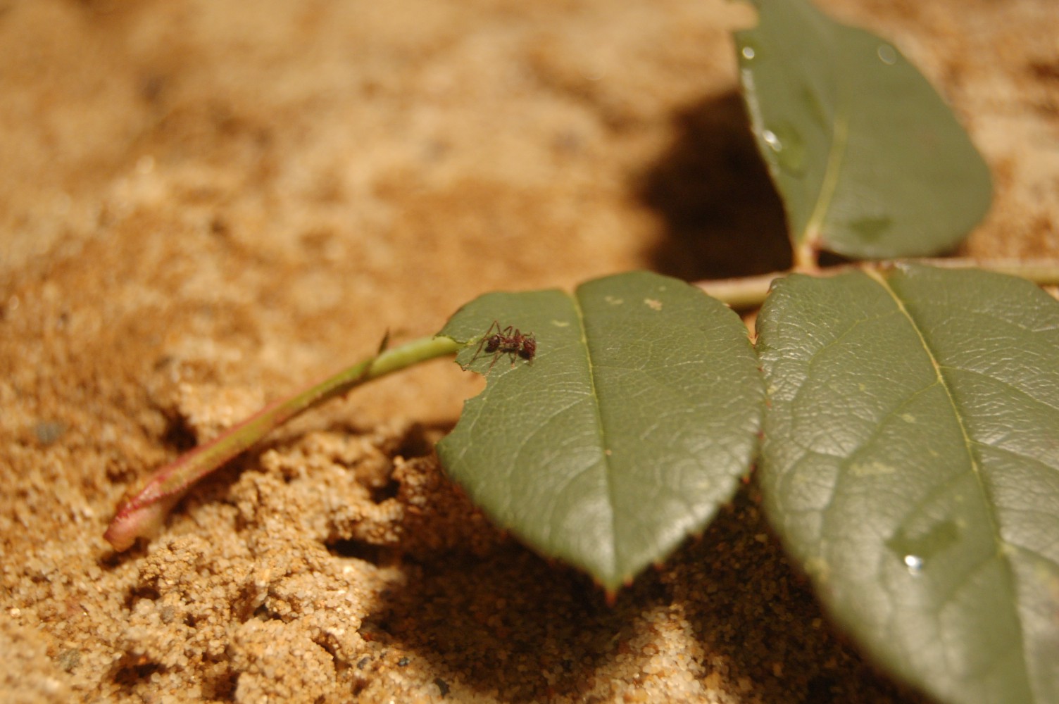 Da Acromyrmex octospinosus semi-claustral gründet, was bedeutet dass sie während der Gründungszeit aus der Gründungskammer herauskommt und Blätter für den Pilz sammelt, habe ich ihr von Anfang ein Brombeerblätter und Apfelstückchen angeboten. Damit war sie aber nie wirklich zu frieden. Sie bekommt nur noch Rosenblätter aus dem Garten meiner Mutter. Müssen natürlich unbehandelt sein.