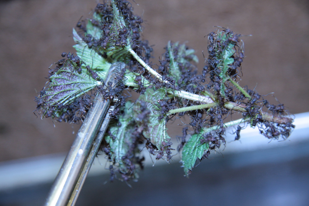 Als Gründerkolonie und kleinere Kolonie waren sie davon nicht begeistert, heute sind sie gleich dabei, brauchen sie doch die Stängel nur auf Länge schneiden.