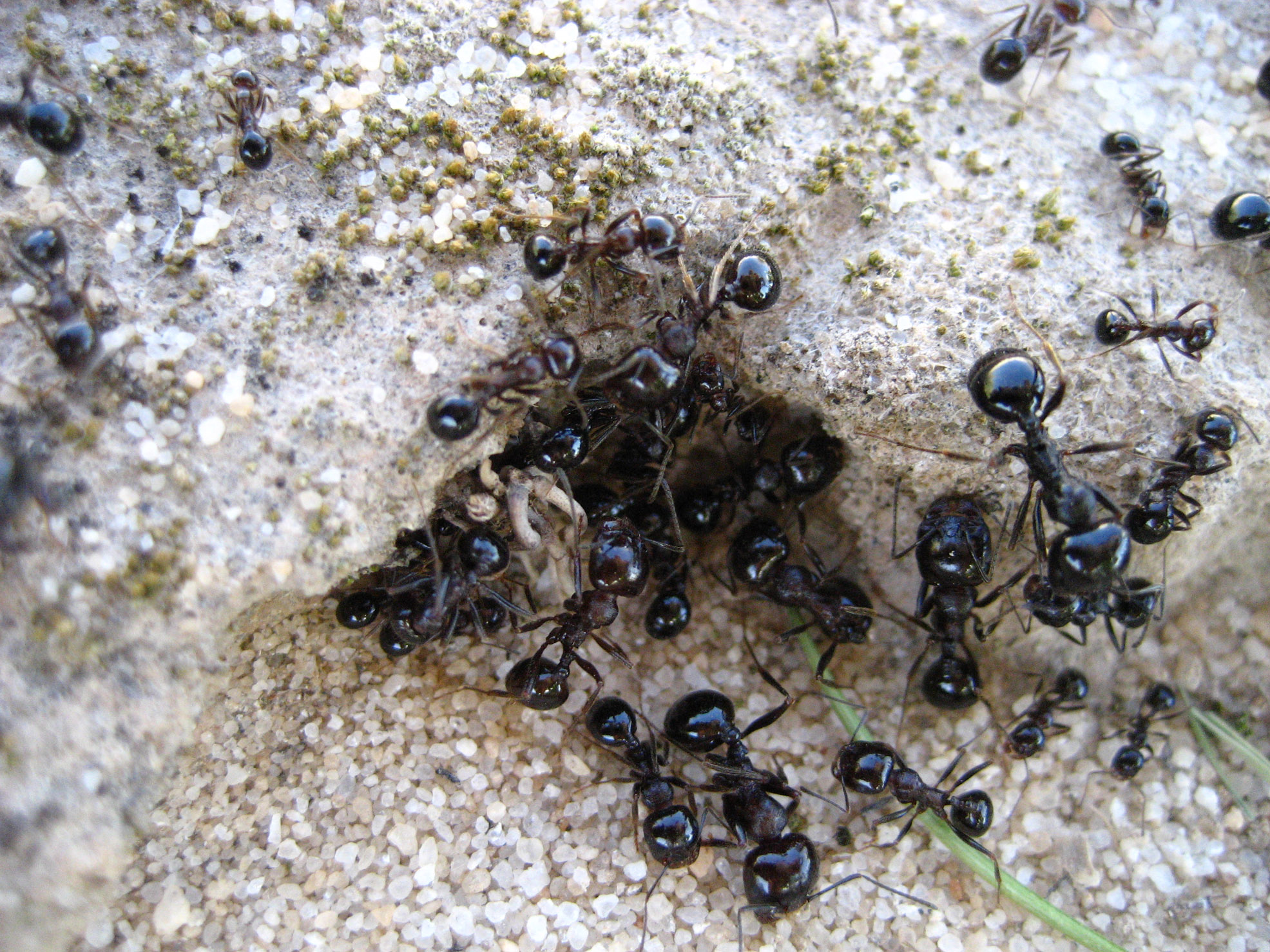 Da ich viel dazugelernt habe kann ich mich mit Sicherheit bei der unteren Stefans Meinung anschließen. Der große Kopf mit den kräftigen, gezahnten Madibeln, das häufige Vorkommen von Soldaten und die nahezu völlig in der Gegend fehlenden Insekten deren Bestand längst nicht so groß ist als das sie einen so riesigen Bau (weit über 1000) hätten ernähren können. Mit den Mandibeln der oberen Arbeiterin hätte man gar keine Körner knacken können, was ich mit meiner handlichen Digital Ixus leider nich so gut fotografieren konnte. Außerdem hab ich die obere Art nur in feuchteren Gebieten gefunden wo mehr Tiere und mehr Pflanzen vorhanden waren.