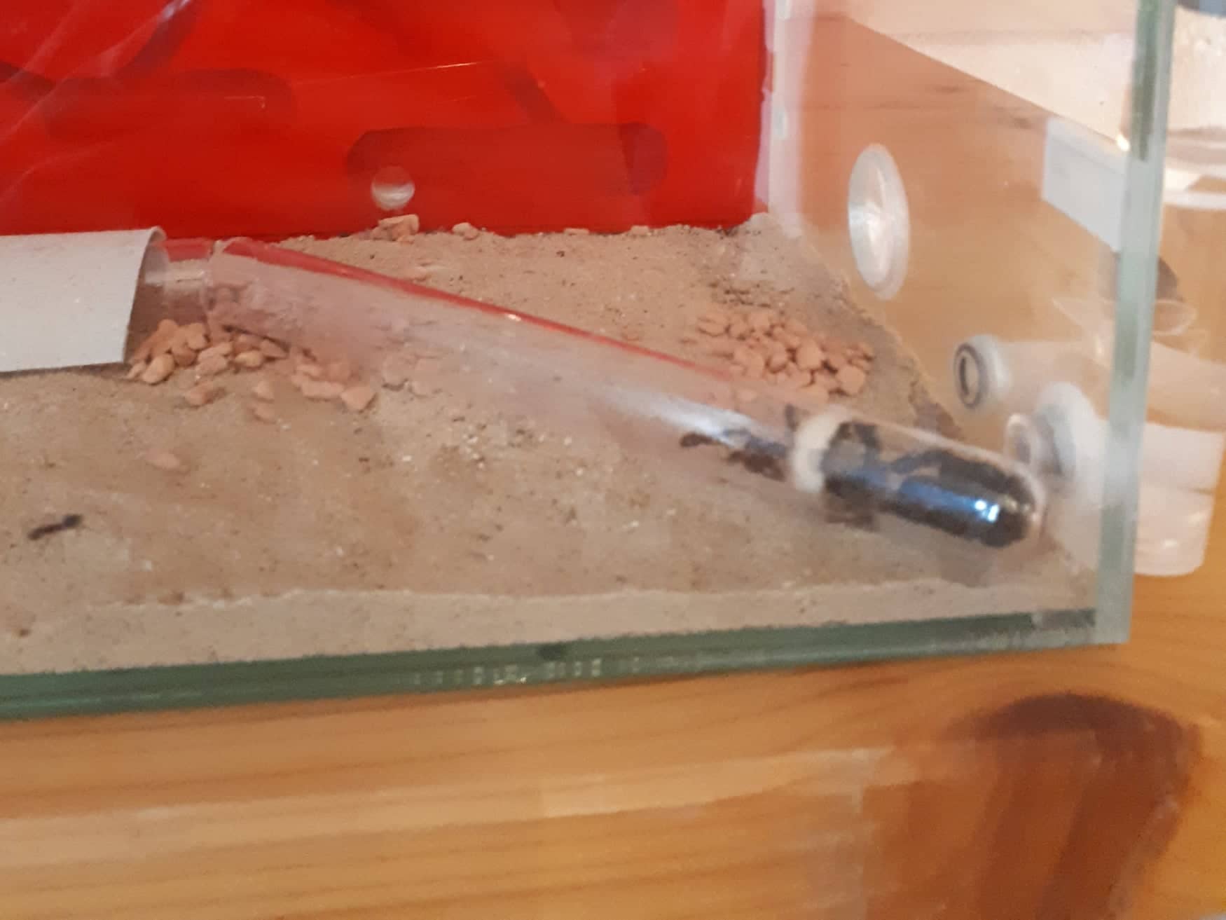 Hallo, ich habe folgendes "Problem": Meine Camponotus ligniperdus leben seit April in einem Reagenzglas ohne Wasser und durchgefressener Watte. Dies hat sie nicht davon abgehalten, dieses Jahr von vorher 4 auf etwa 25 Arbeiterinnen gewachsen zu sein. Ein paar Eier und Larven sind auch noch vorhanden. Da aber die Winterruhe in so 2 Monaten einsetzt, möchte ich, dass sie in ein neues RG ziehen. In das angebotene Gipsnest, welches ich von Anfang an in der Arena hatte, ziehen sie nicht, ist aber für die Kolonie auch noch eine Nummer zu groß.
