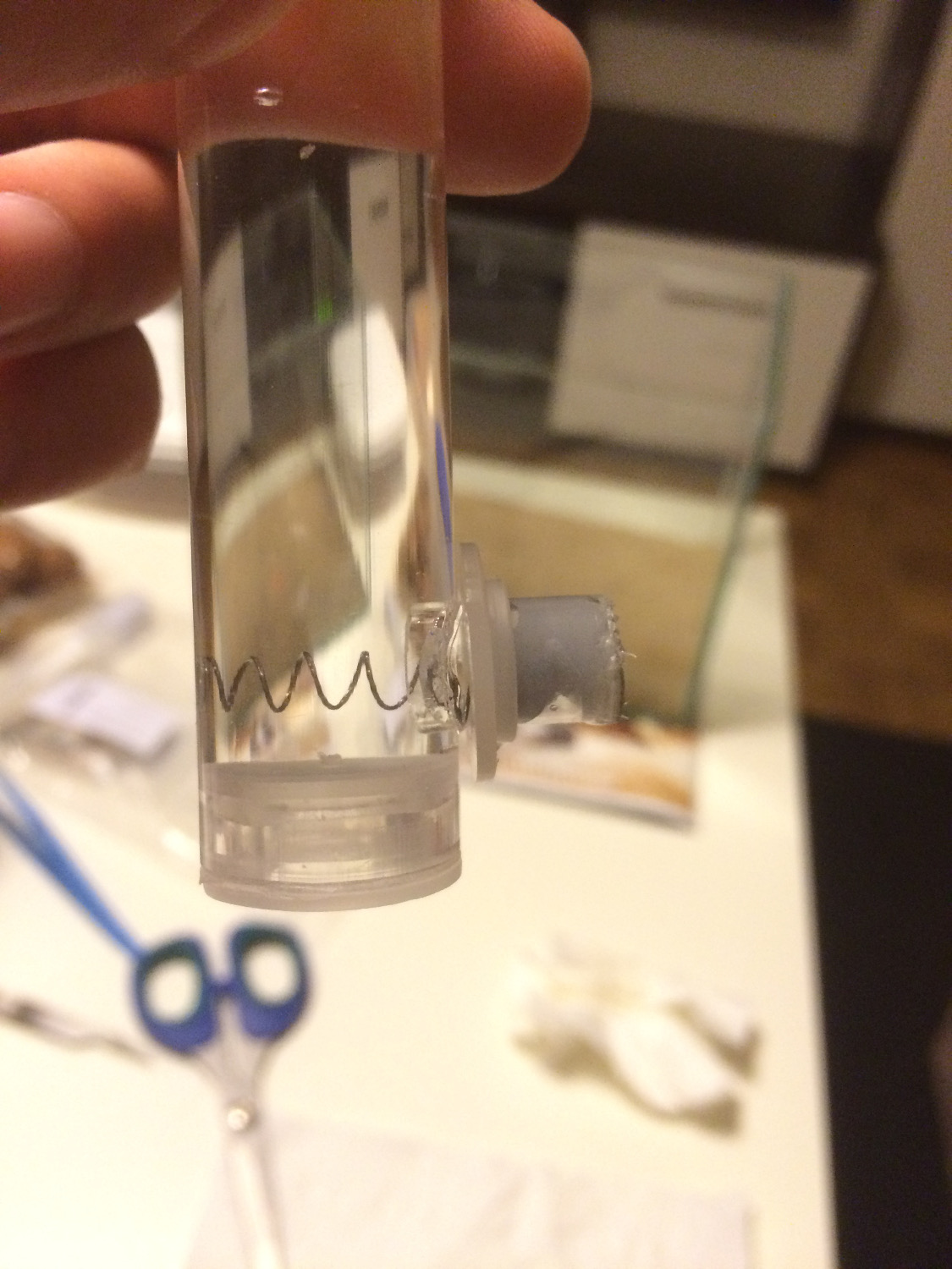 Alles andere ok, nur die Wassertränke hat ständig Probleme gemacht. Qualitativ leider nicht so toll die Wassertränke. Das fing schon damit an, dass das Metallgitter nicht gut verklebt war, die untere Hälfte war nicht fest. Hab das mit Sekundenkleber geklebt. Dann als Nächstes Wasser eingefüllt und dran montiert. Schien zunächst dicht zu sein. Über Nacht ist aber 4/5 der Flüssigkeit ausgelaufen und die Arena war zu 2/3 durchfeuchtet. Aus dem Metallgitter ist alle 3-4 Minuten Wasser rausgetropft. Meine Vermutung war zunächst, dass vielleicht der Schwamm sich vom Metallgitter minimal entfernt hatte und dass das ein Durchfliessen des Wassers ohne Widerstand ermöglicht hat. Nach der Suche hier im Forum kam mir dann die Idee den Schwamm mit Hilfe einer Metallfeder aus einem Kugelschreiber zu fixieren und auf Spannung zu halten. Aber nicht mit zu viel Spannung, damit das Metallgitter nicht zu sehr belastet wird. Sondern erstmal die entspannte Feder von außen anlegen und schauen, dass das Ende der Feder 4-5mm vor dem Gitter liegt und dazwischen dann der Schwamm. Mit etwas Fingerspitengefühl bzw Pipettenspitzengefühl geht das relativ einfach. Siehe Fotos. Der Schwamm war nun sehr schön fixiert. Doch das Problem mit dem raustropfendem Wasser bestand nach wie vor. Aber jetzt war es wenigstens sichergestellt, dass die Ameisen durch das Gitter an den Schwamm kommen und trinken können.