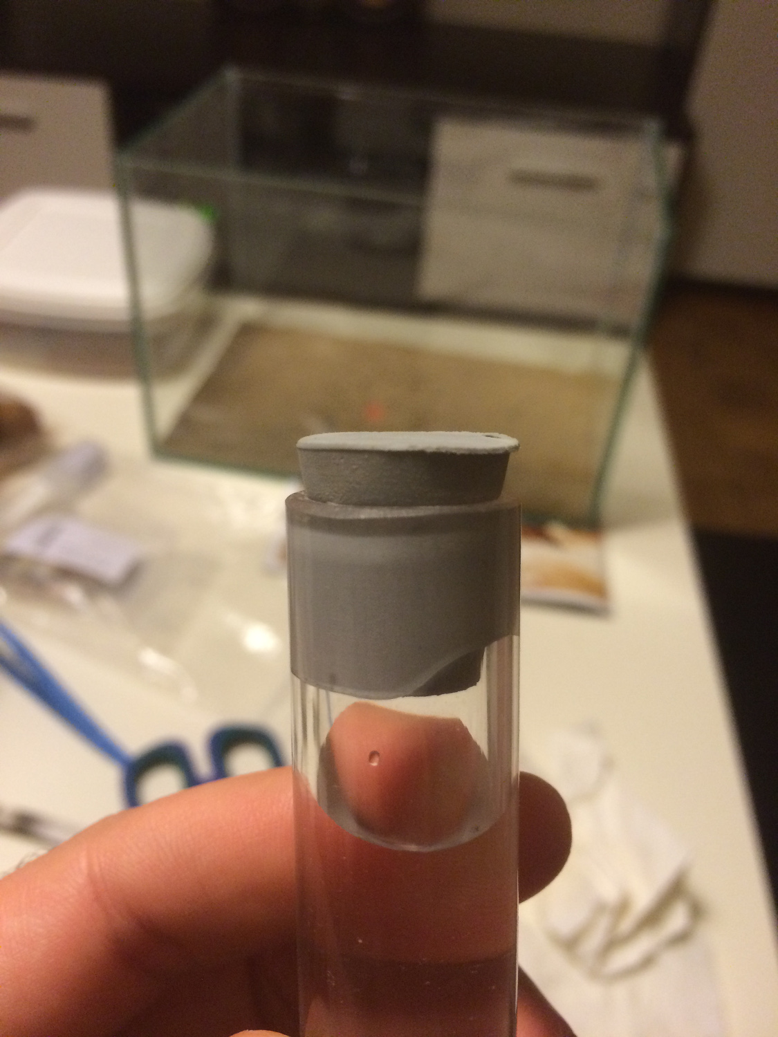 Bis dahin habe ich die Wassertränke einfach mit der Pipette befüllt und dann den Gummistopfen oben reingedrückt so fest es ging. Alle 3-4-5 Minuten kam wieder tropfenweise Wasser unten aus dem Gitter. Später bin ich dann auf die Idee gekommen den Gummistopfen vor dem Einsetzen kurz ins Wasser zu tun, damit da ganz klein wenig Wasser dran haftet und auch die Innenwand der Tränke mit dem Finger nass zu machen und erst danach den Tropfen reinstecken. Nun war da ein Wasserfilm zwischen Röhrchen und Gummistopfen zu sehen, siehe Foto. Jetzt wars sozusagen Luftdicht. Auch nach 24 Stunden kein Tropfen Wasser rausgetropft. Ich weiss nun leider nicht was mit diesem Wasser zwischen Röhrchen und Gummi passiert, obs da bleibt oder obs nach ein paar Tagen verdunstet oder runterfliesst und von oben wieder Luft reingesogen wird und deshalb unten das Wasser wieder raustropft. Sollte das wieder nicht funktionieren, dann versuche ich es mit etwas was nicht verdunstet und dickflüssig ist wie Honig oder Olivenöl hauchdünn den Gummistopfen bestreichen und dann reindrücken.