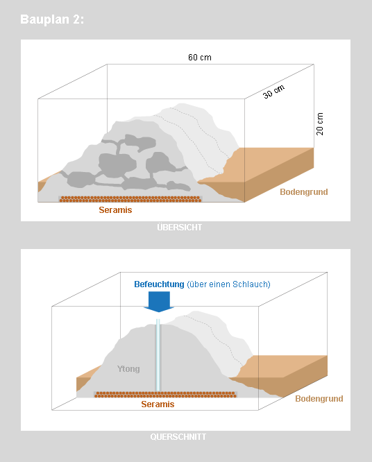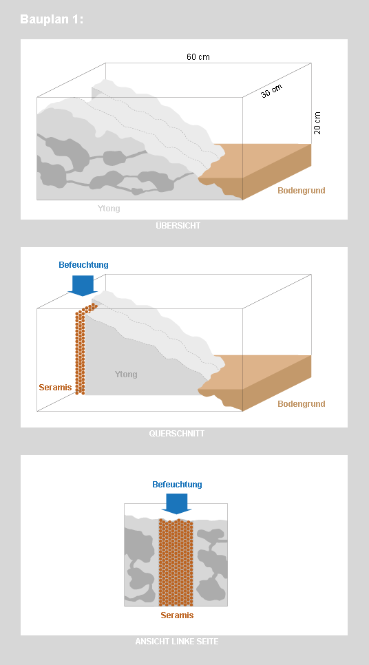 7.) Zur Befeuchtung... bei den meisten Beispielen, die ich mir angeschaut habe, wird das Nest entweder von oben oder von unten befeuchtet.. wäre es möglich, dies wie auf bei Bauplan 1 von der Seite zu machen? Oder würde das gar so gar nicht klappen? Ich hatte gedacht, dass man evtl noch irgendeine Pflanze in das Seramis reinsetzen könnte... die überschüssiges Wasser vernichten würde (und schön aussieht