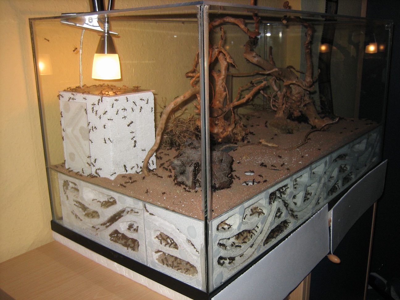 Die 2 Teile zusammen fertig. Die Ameisen kammen nicht ins andere Nest. meine Idee war, wenn die Zeit gekommen ist, einfach leicht Wasser von oben aufs Nest drauf geben, damit das Papier feucht wird und kaputt geht.