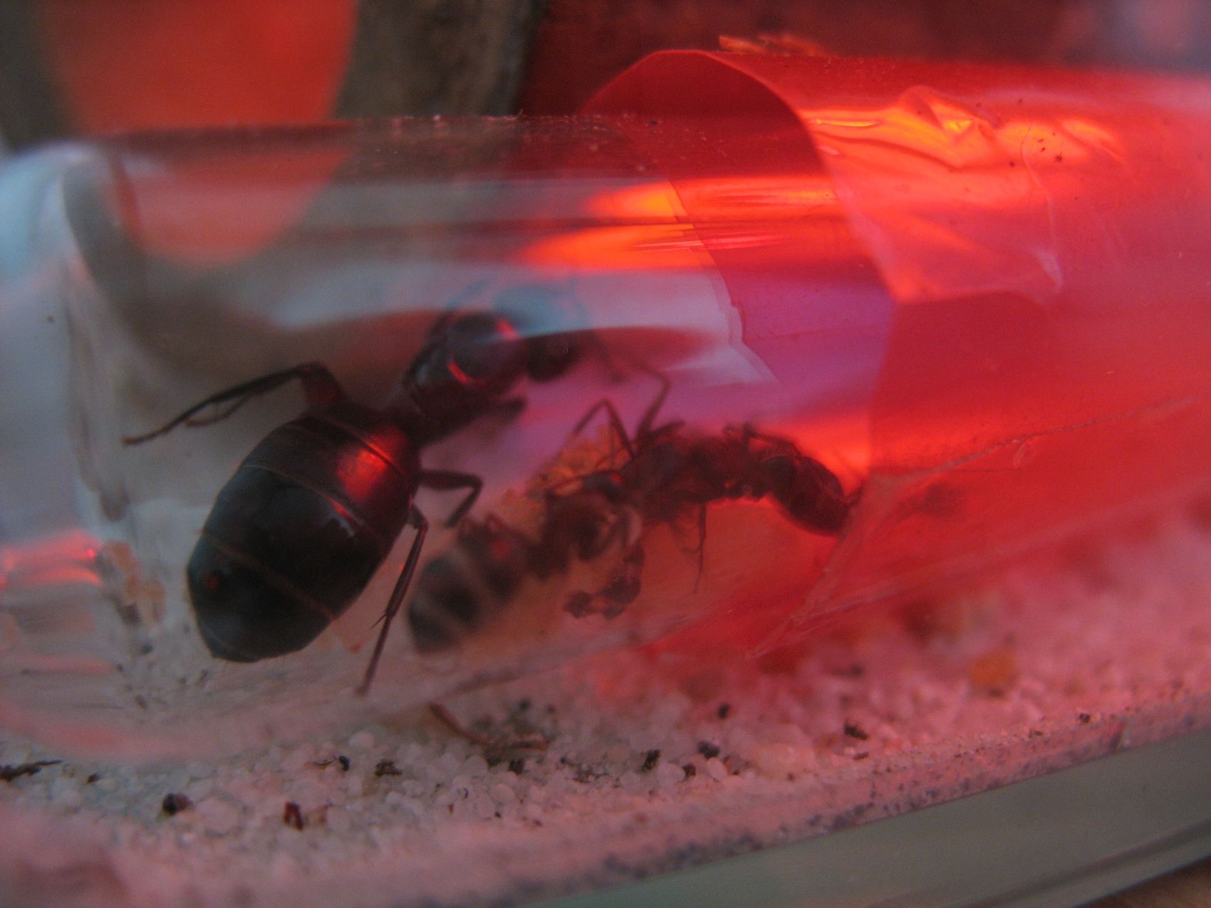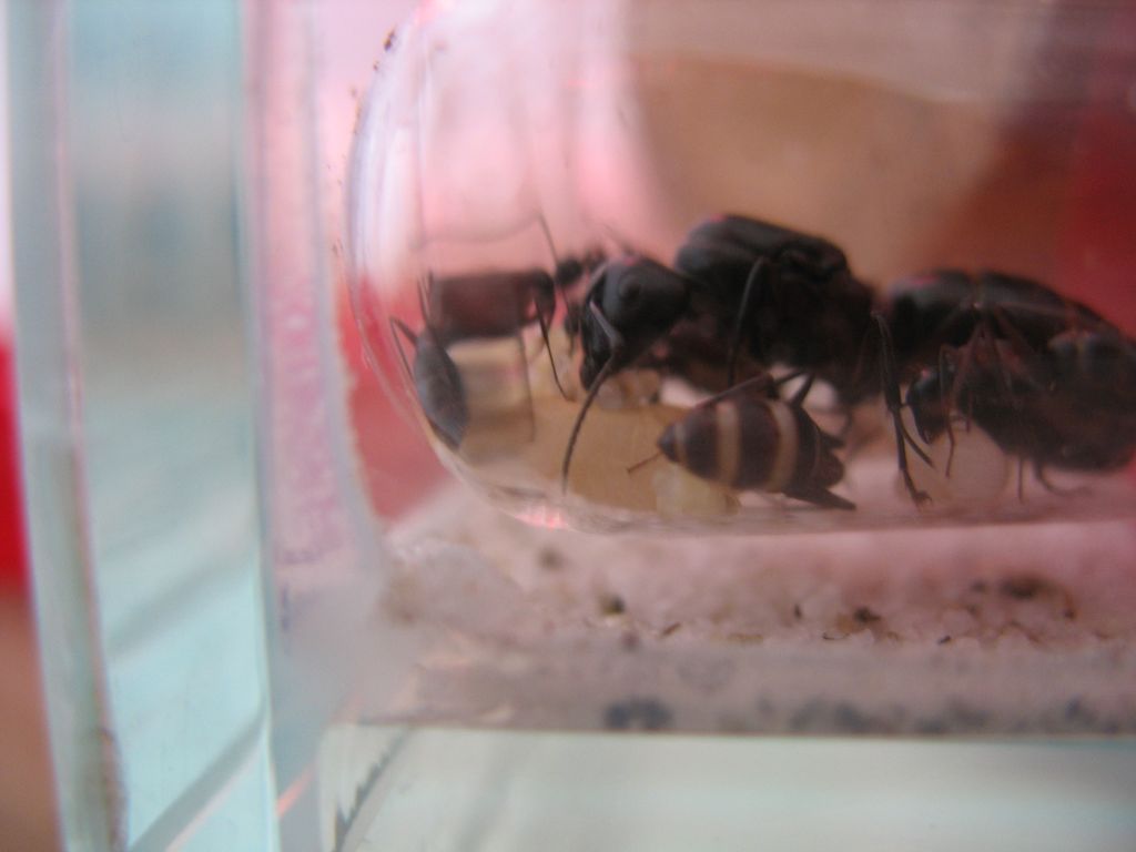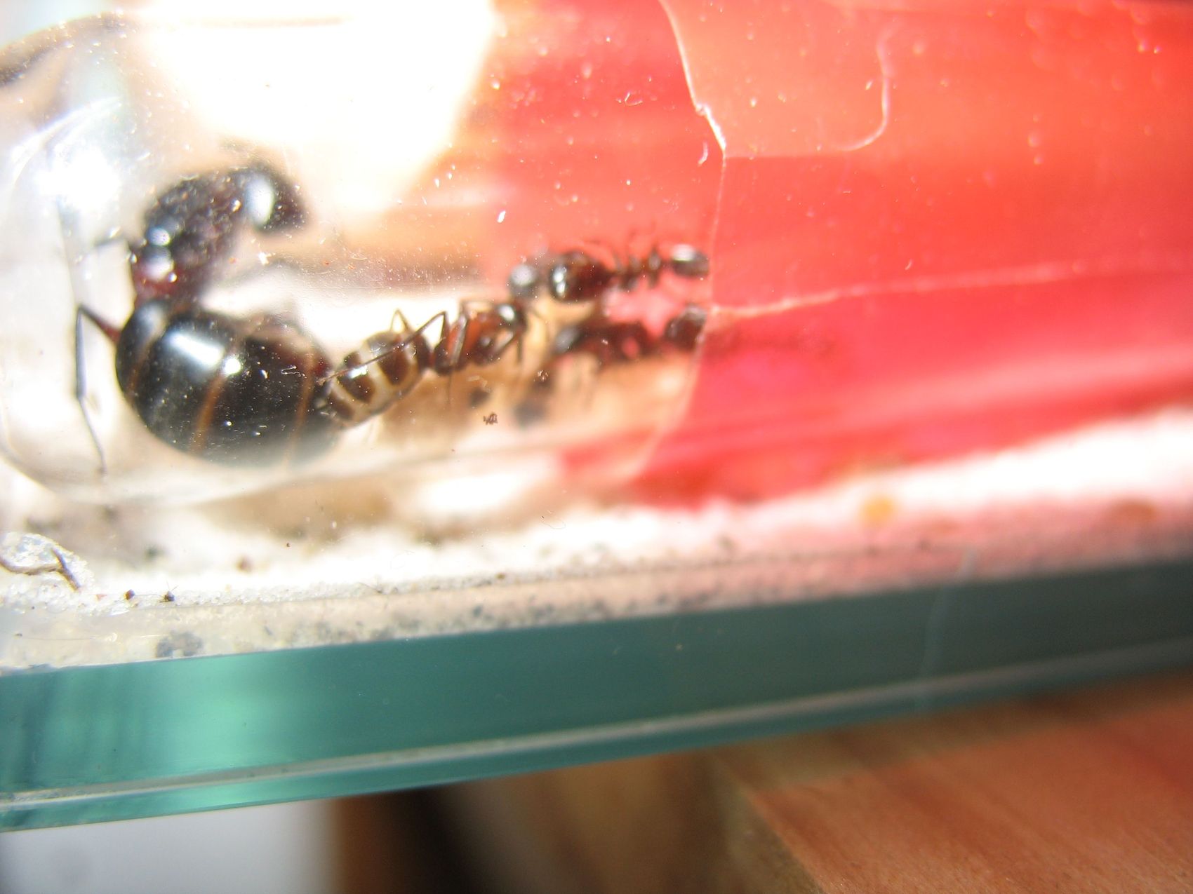 Auf beiden Bildern kann man erkennen, dass die Königin am gesamten Körper recht dunkel ist. Ob das nur an der Belichtung liegt, weiß ich allerdings nicht. Falls nicht, deutet das auf Camponotus herculeanus hin. Bei den Königinnen von Camponotus ligniperda ist die teilweise Rotfärbung des Körpers intensiver und kräftiger. Sie reicht außerdem über den Petiolus hinaus bis auf das erste Gastersegment.