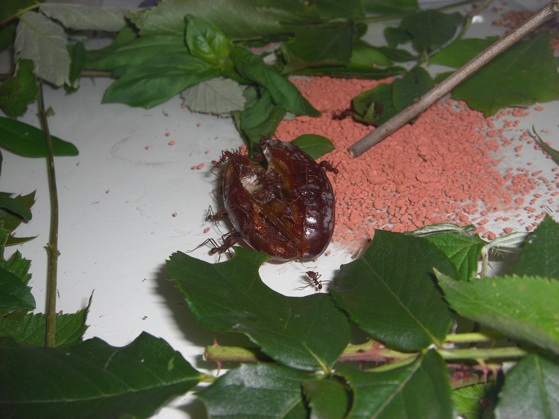 Dauerte einige Minuten, aber nun kann man sehen das meine Attas der Dattel nicht widerstehen konnten. Sie wurde mit den Fühlern abgetastet und seid ein paar Minuten kommen immer mehr Ants unter der Tupperdose hervor, und machen sich auf den Weg Richtung Dattel. Das weißliche Innere wird schon fleißig abtransportiert.