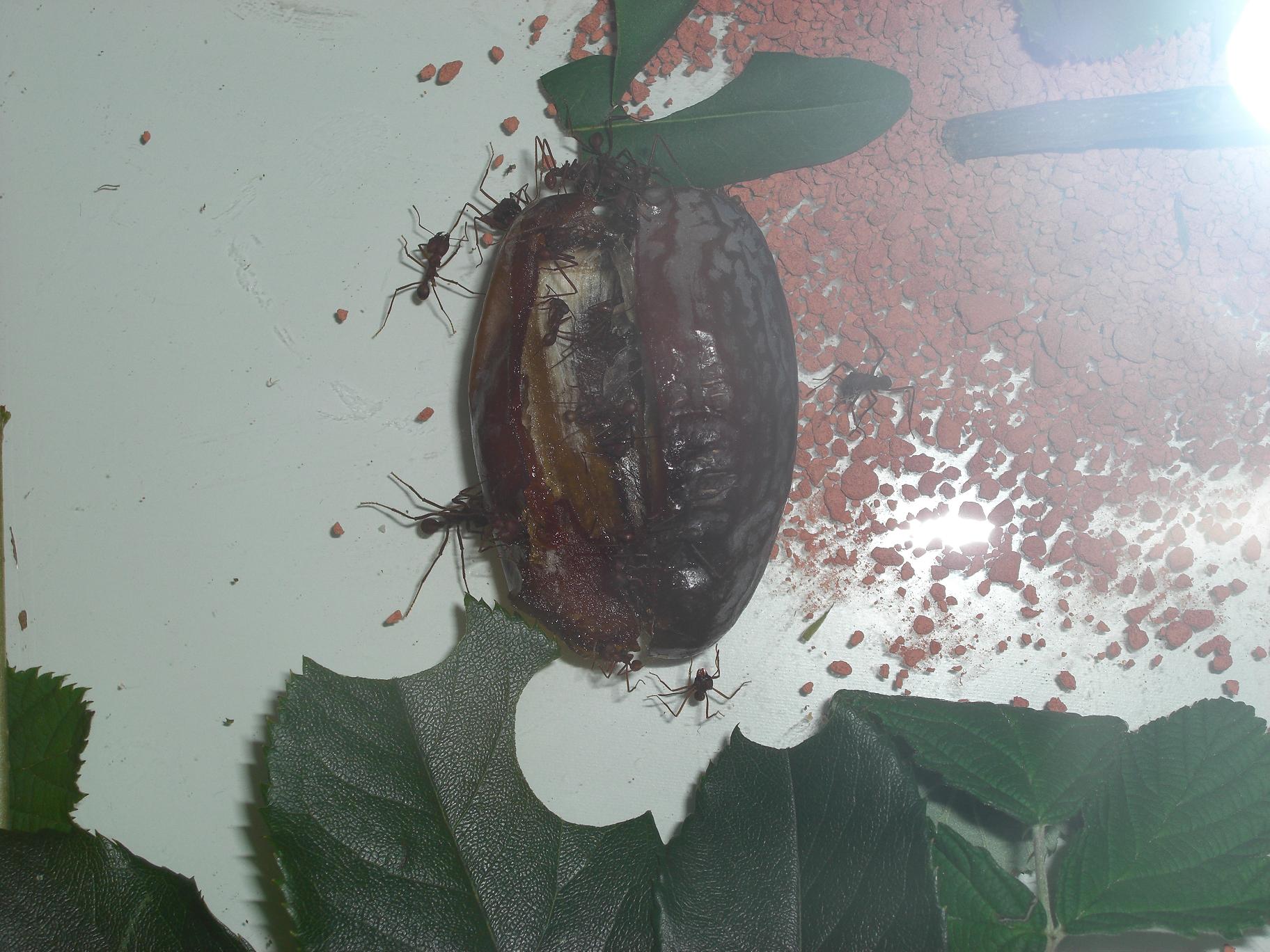 Hier nochmal von oben. Etwas schwer zu erkennen, aber in der Dattel ist alles voller Ants, welche sich am Fruchtfleisch zu schaffen machen.