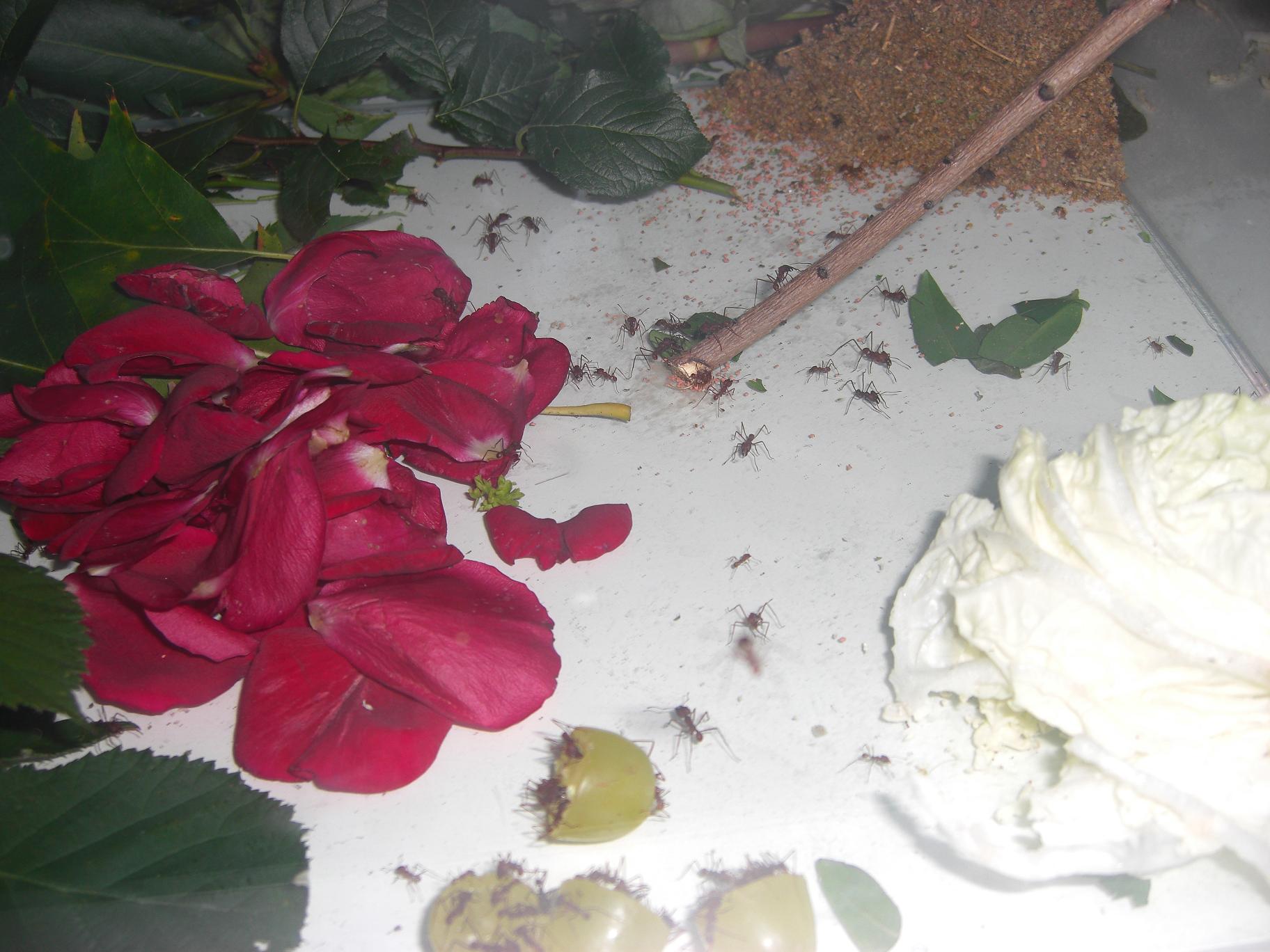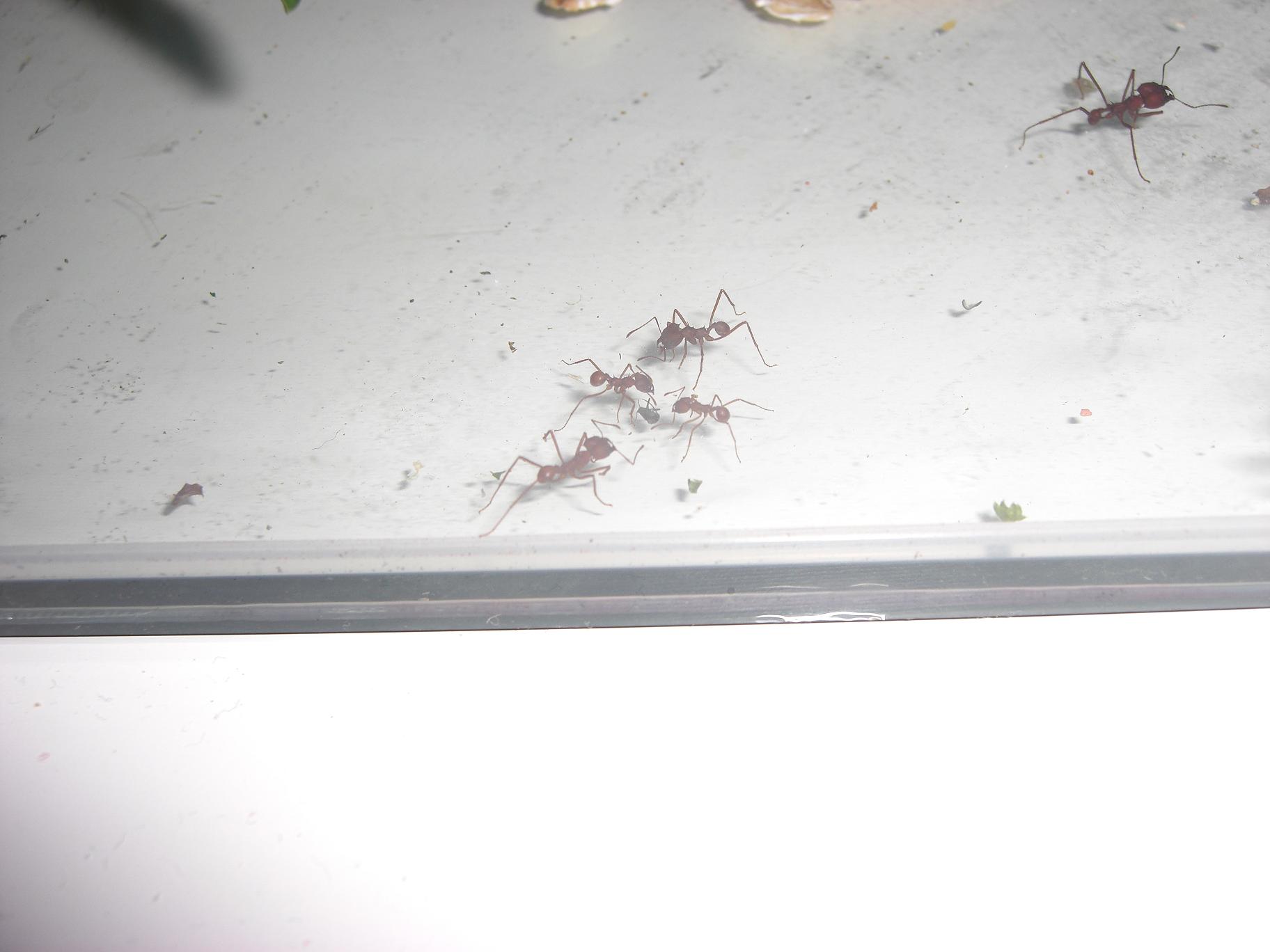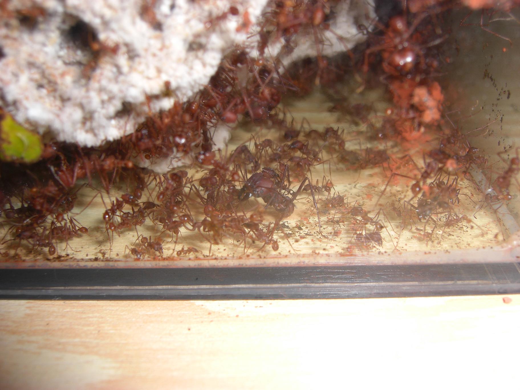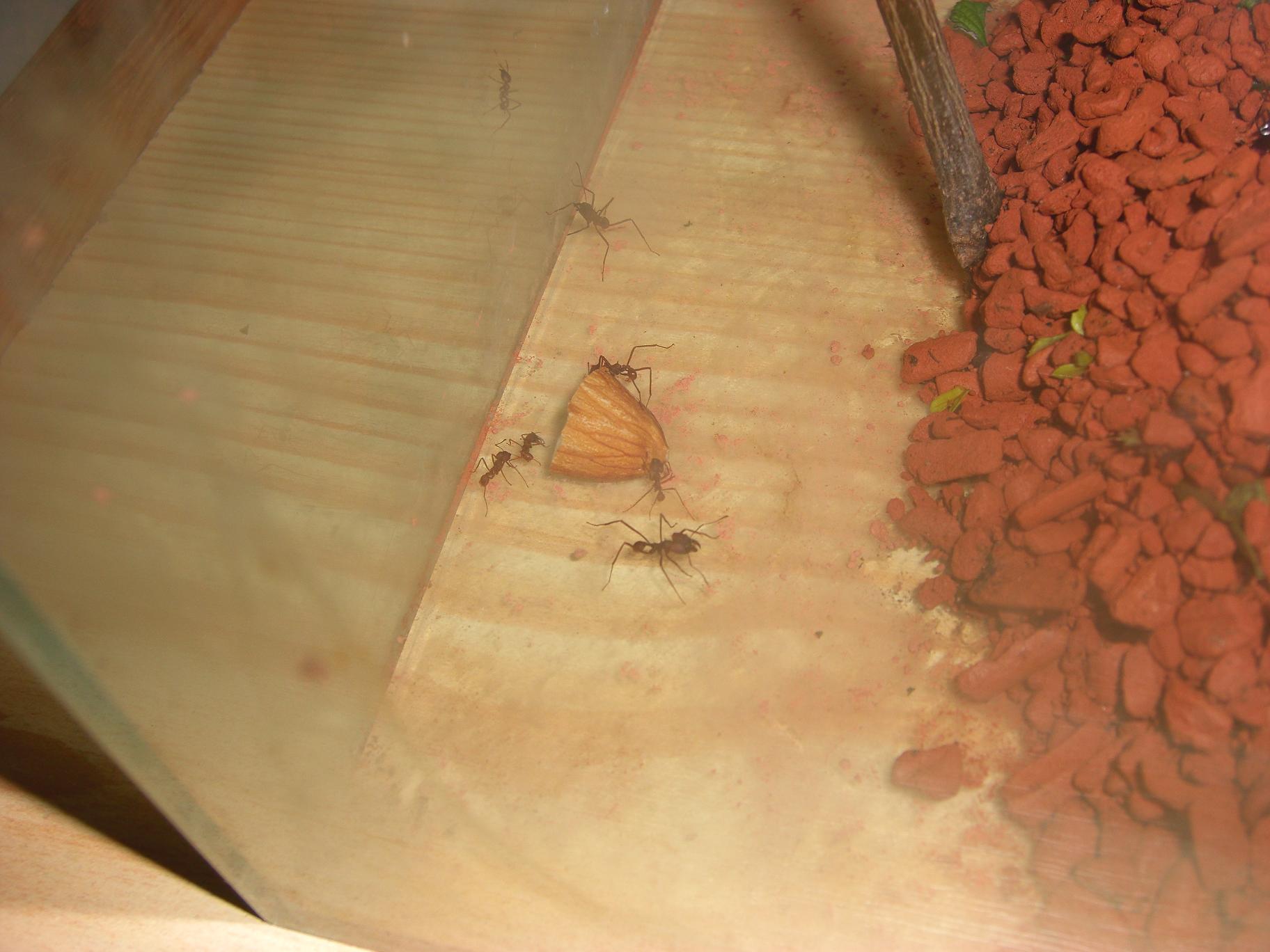 Das Bild im oben genannten Beitrag ist merkwürdigerweise nicht auf der Speicherkarte gewesen. Hatte das Bild morgens gemacht, musste aber auf die Arbeit und am Abend war die Speicherkarte leer. Nichts desto trotz, habe ich wieder ein paar Schmankerl vorbereitet. Heute konnte ich sehen wie meine Ants eine Fliege erlegt hatten und gut ne halbe Stunde mit offenen Mandibeln um die "Leiche" herumstanden. Womöglich feierten sie ihren "Triumph" (gegen eine 3-5 Milimeter Fliege, welch ein immens schwerer Gegner). :)
