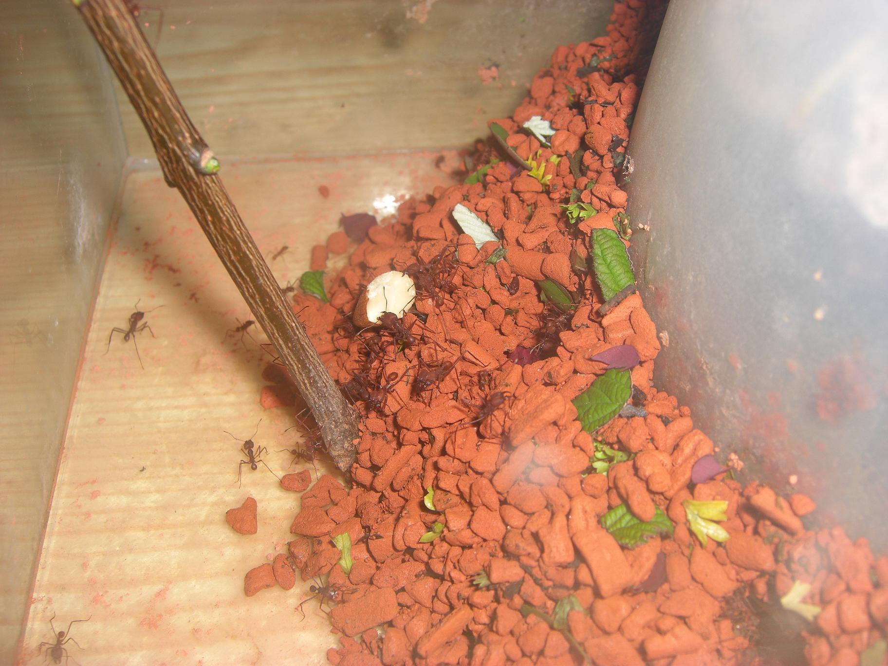 Meine Ants schneiden auch tagsüber, aber wenn es spät wird (ab ca 20 uhr) kommt eine kleine Welle ins rollen. Ich weiß nicht wie es anderen Haltern geht, aber meine Attas sind vorzugsweise wenn es dunkel ist unterwegs. Habe mal ein Foto von der Aktivität gemacht und eins vom Futterbecken. Werde direkt nach dem Aufstehen ein weiteres zum Vergleich hier posten. Ihr werdet auch gleich erkennen, das meine Kleinen das Futterbecken noch als Abfallkammer nutzen und das dritte Becken komplett ignorieren. Wenn es so bleibt verlagere ich das Futterbecken, aber noch ist der Abfall beherrschbar.