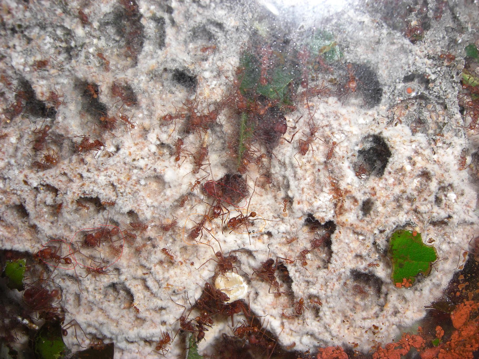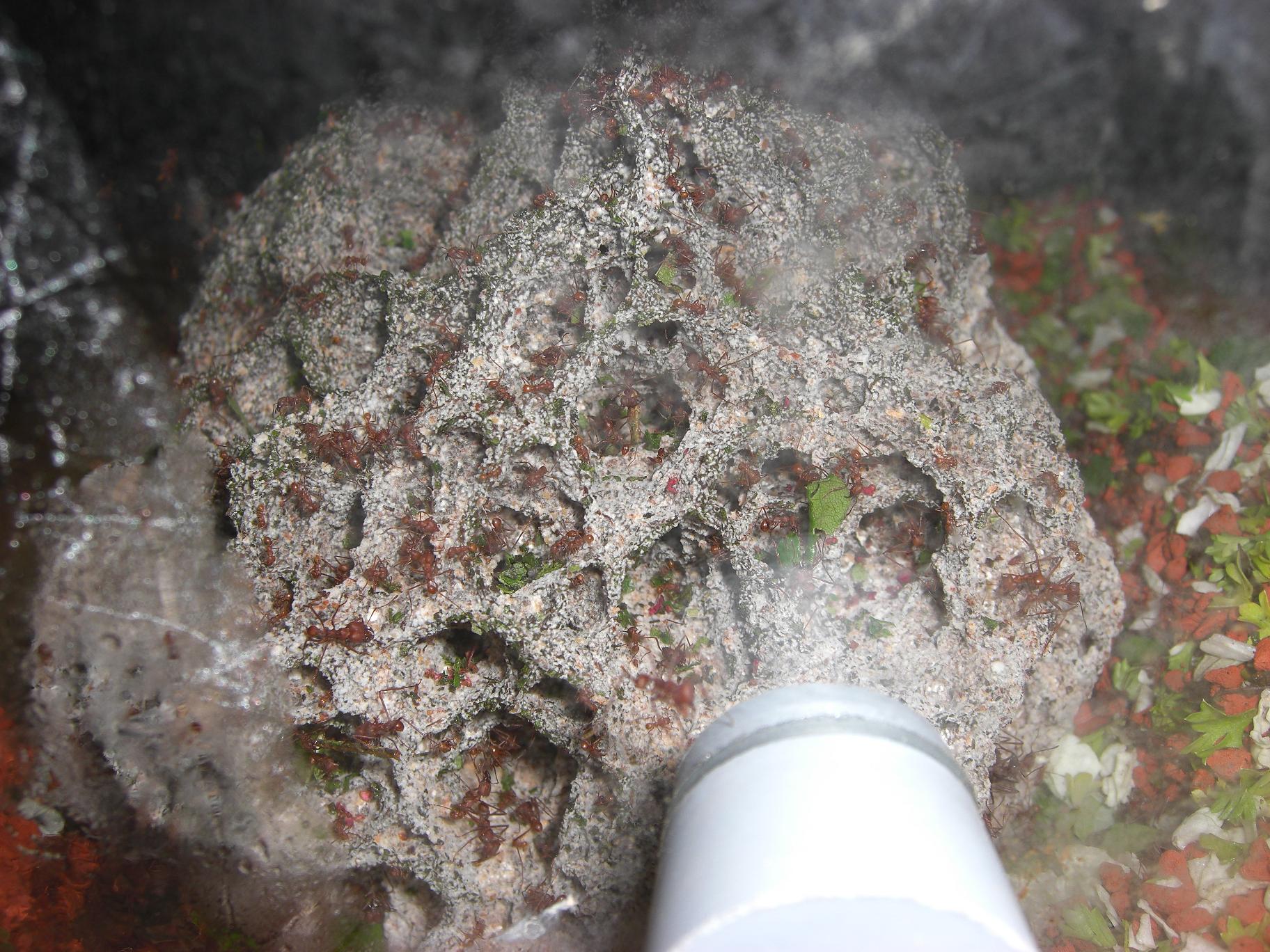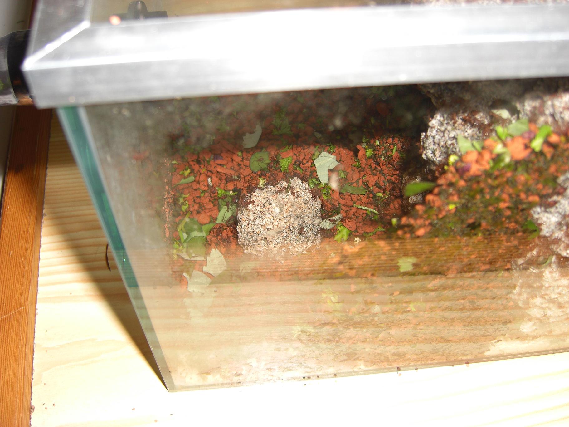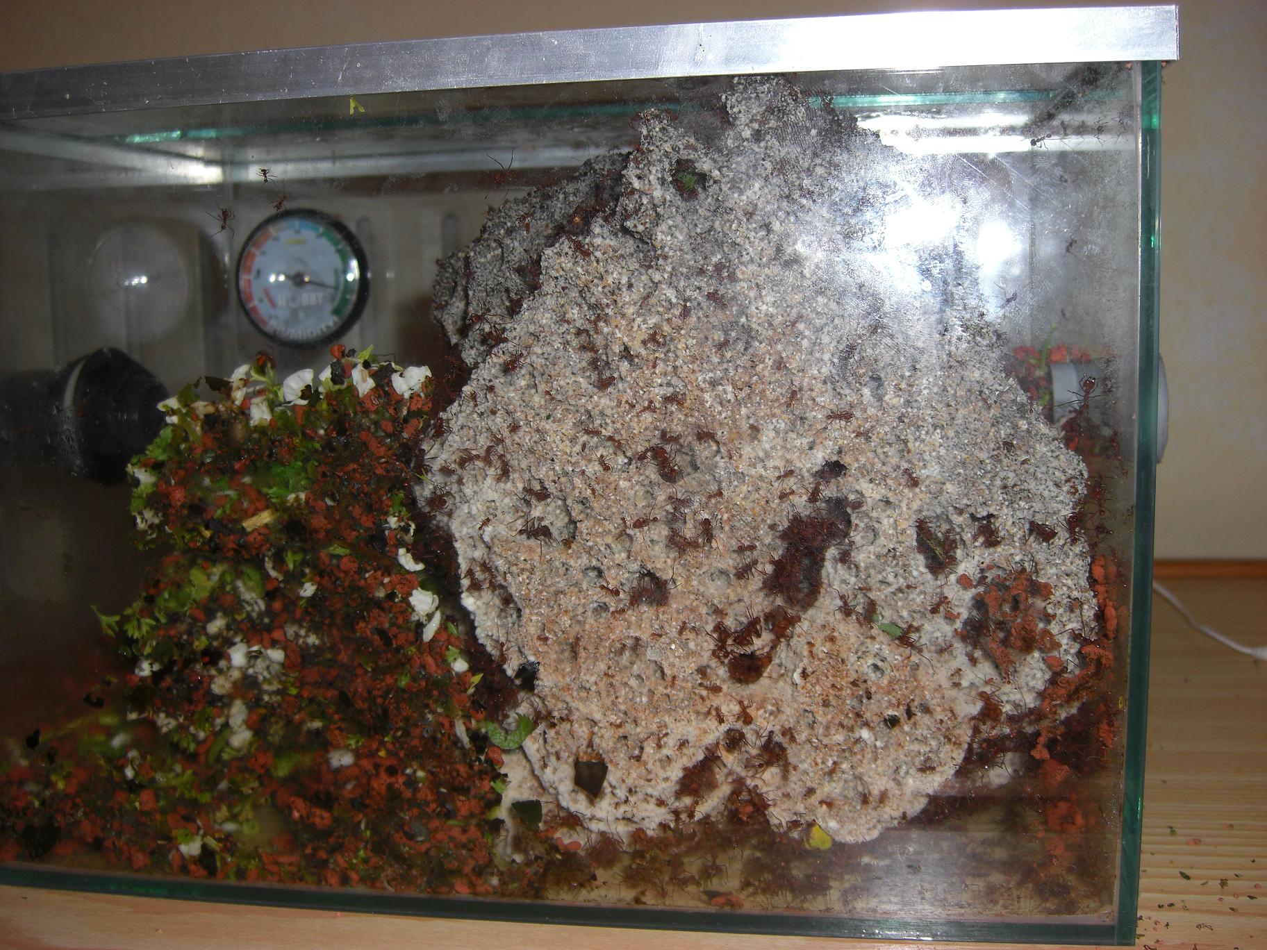 Ein paar Wochen sind ins Land gezogen und es gibt wieder etwas zu berichten, bzw auch etwas zu fragen. Die Tupperdose ist nun augenscheinlich ausgefüllt und das Problem was ich habe ist, das sich der Pilz unweigerlich auch an die Wand "ablegt" und teilweise etwas modert (wegen dem Kondenswasser), da die Ameisen dort schwer hinkommen. Im Becken herrschen laut meiner Anzeige konstant zwischen 80 und 90% Luftfeuchtigkeit, obwohl man davon nichts erkennen kann. Ich wollt die Tupperdose entfernen, aber vorher noch fragen ob ich sie einfach abheben soll oder ob irgendwas zu beachten wäre. Falls im Laufe des Tages von euch nichts kommt, handle ich wie immer wieder nach bestem Wissen und poste euch die Fotos der Aktion. :)