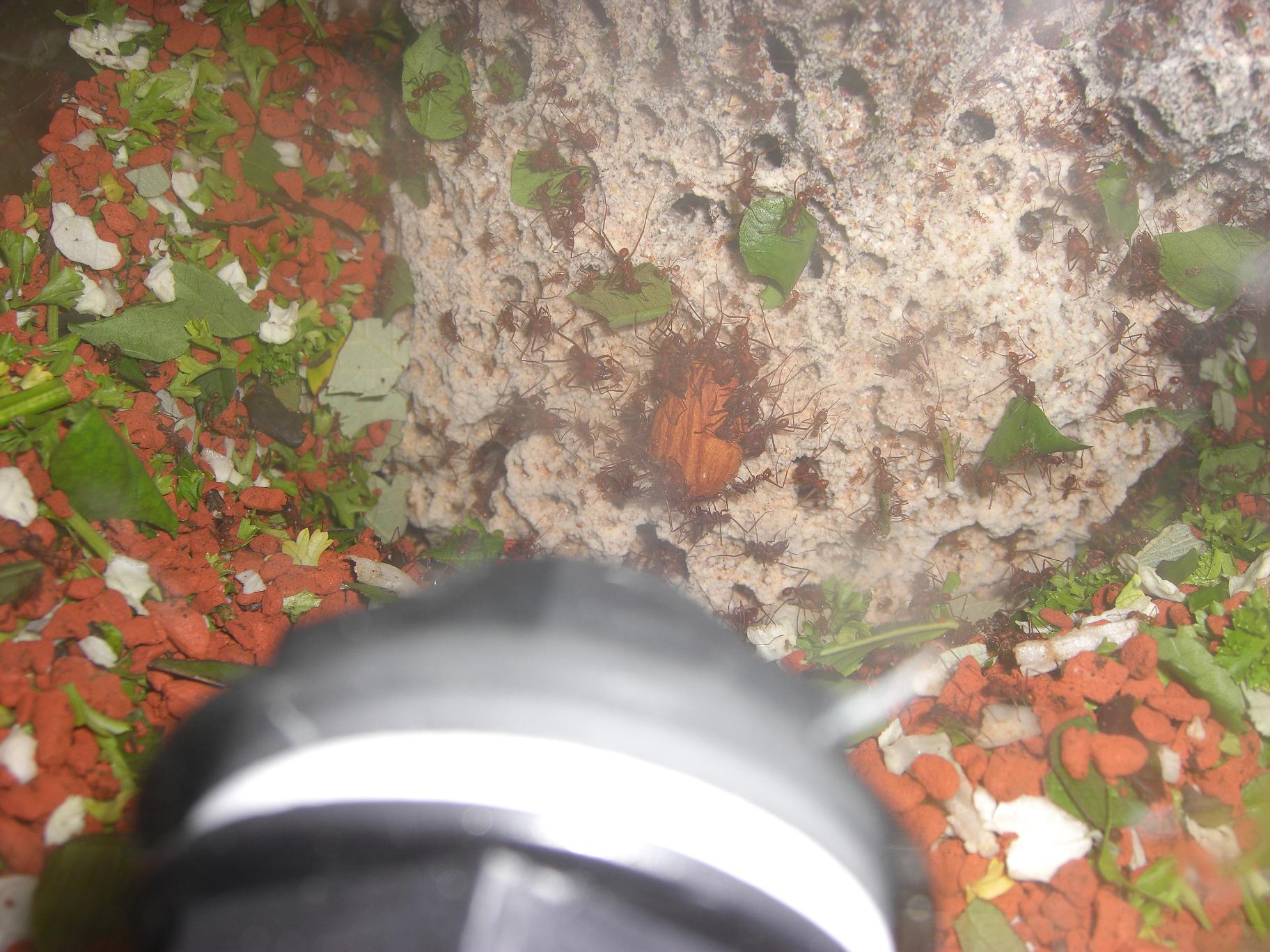 Ich habe heute mal den Deckel abgenommen und ein Foto vom Pilz gemacht, sozusagen aus der Vogelperspektive. Alle Ants blieben brav im Becken (zum Glück) und nach 1 min konnte ich den Deckel wieder problemlos oben draufsetzen. Auch habe ich eine Stelle entdeckt, wo man gut die unterschiedlichen Ameisen sehen kann (im Bezug auf Größe). Ach ja und sry an dich Erne, Makroaufnahmen sind mit der Kamera nicht möglich, aber ich hoffe auf dem zweiten Foto kann ich dir und allen Anderen die verschiedenen Größen etwas näherbringen.