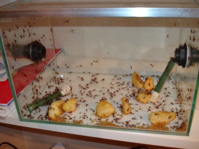 Die Kolonie ist ca. 1/2 Jahr alt. Angefangen mit ca. 50 Tieren und einem Pilz mit der größe eines Tischtennisballes, ist sie jetzt auf rund 300 Tiere herangewachsen. Ich halte sie, wir ihr seht, in einer Anlage die aus zwei XL-Farmen (60*6*30cm und 30*6*20cm), zwei Abfallbecken (30*20*20cm), einer "Vorkammer" (40*30*20cm) und einer Futterkammer, die ca. 2m entfernt ist (50*80*40cm) [B:H:T].