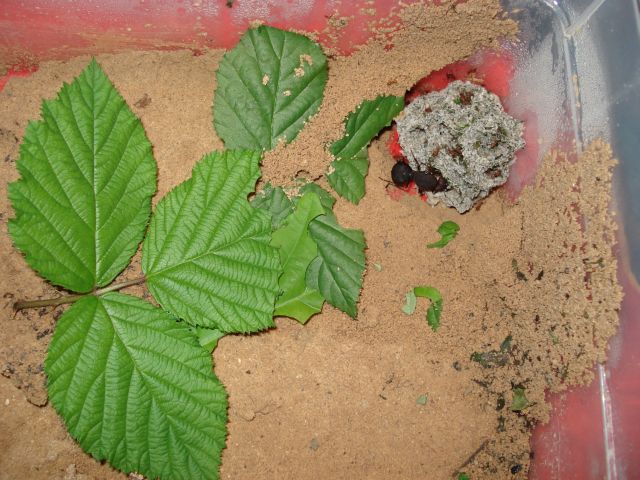 Hier die große Futterkammer. Ich habe eine Lampe oben drauf gestellt um zu verhindern das die Ameisen auch dort noch Pilz anbauen. Hoffe es funtioniert. Gefüllt mit frischen Brombeerblättern.