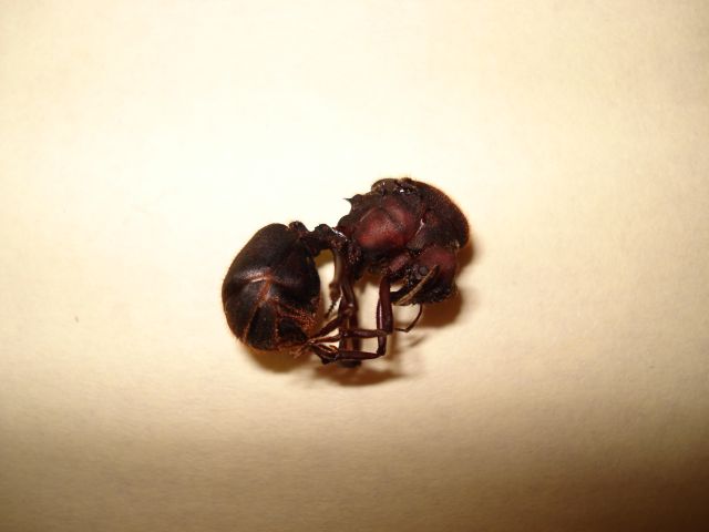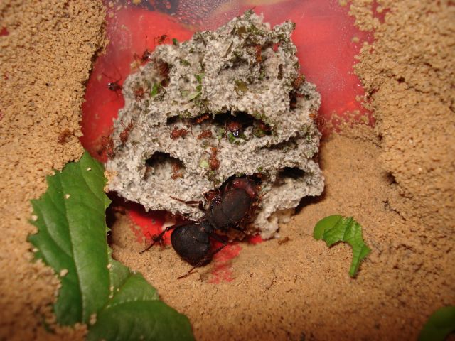 update: ich habe den eindruck das es langsam immer mehr ameisen werden. die königin ist wohlauf und der pilz ist auch ein wenig gewachsen. sie schneiden jeden tag stücke vom großen baltt ab und verbauen sie in den pilz. anzahl der arbeiterinnen in etwa auf 50 geschätzt.