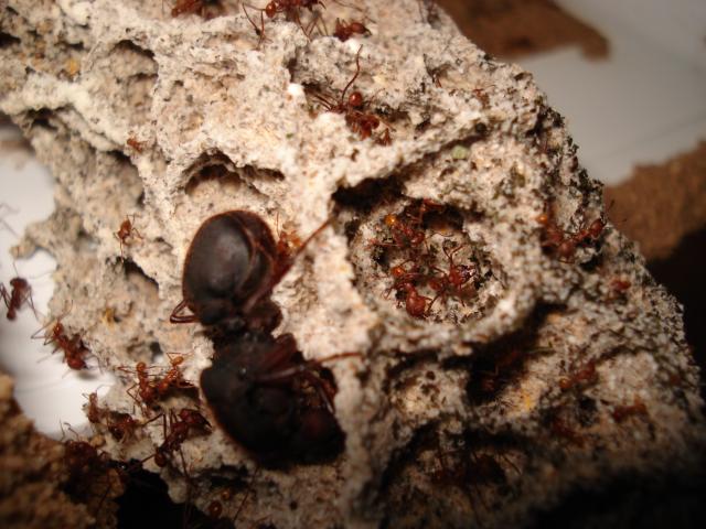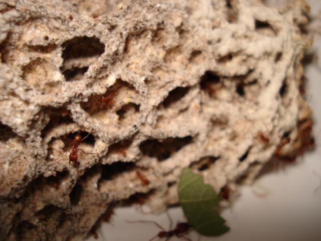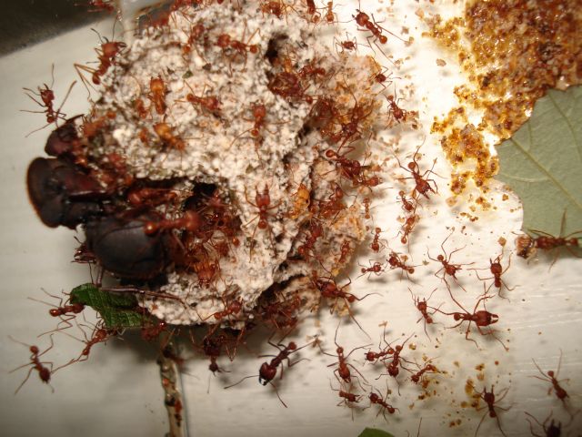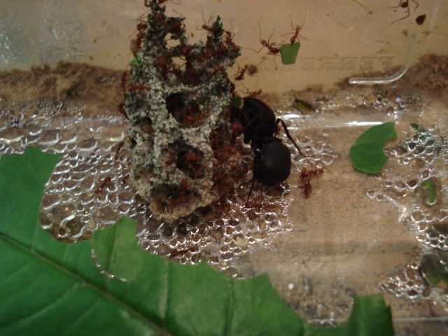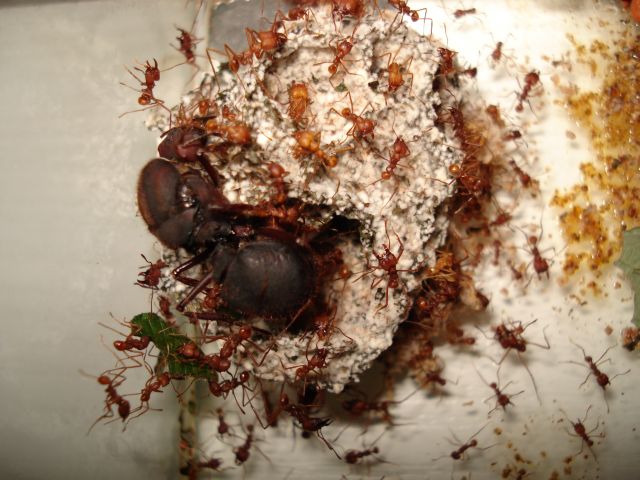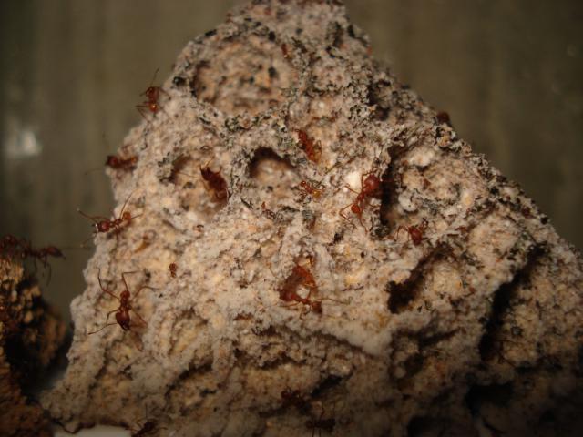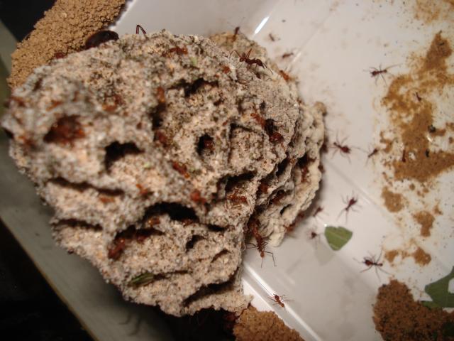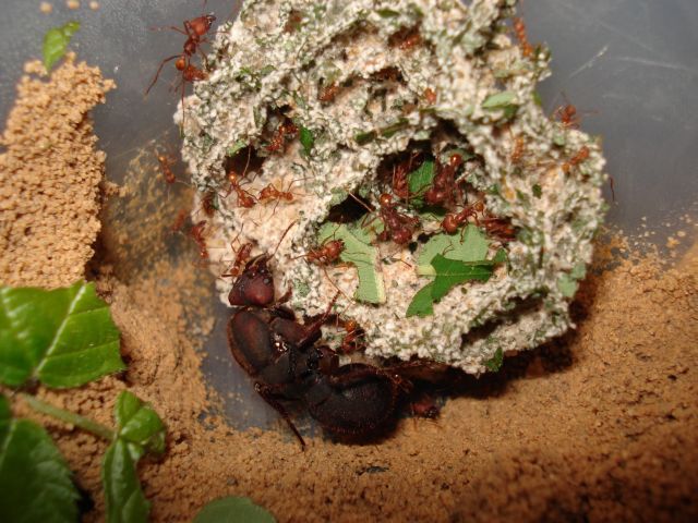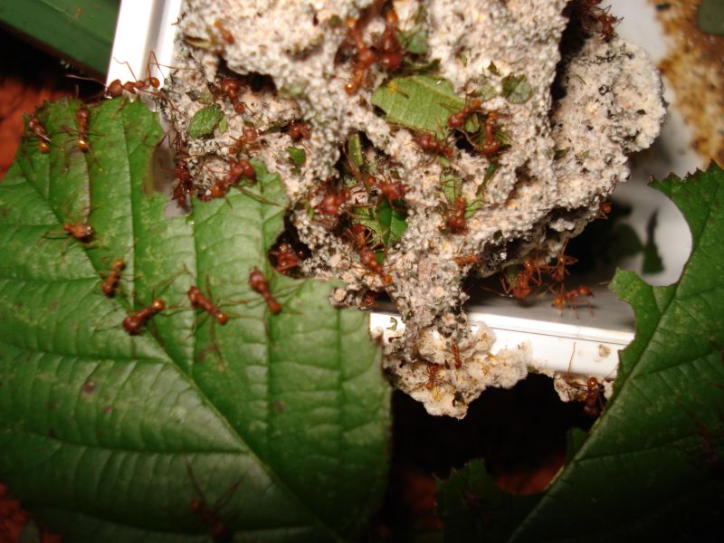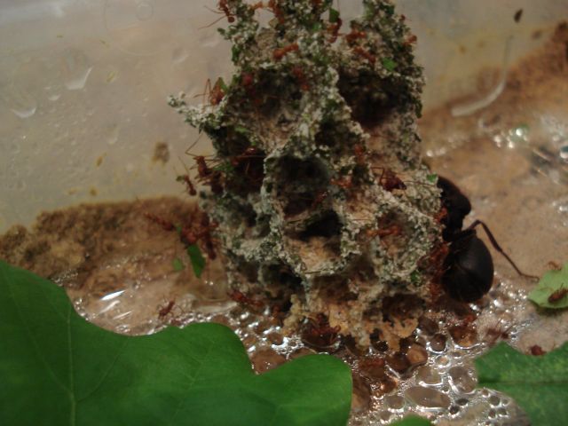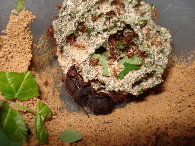 Ich habe mir seit Mai 2007 eine kleine Atta sexdens - Kolonie zugelegt. Es waren vielleicht 15-20 Arbeiterinnen unterschiedlicher Größe und der Pilz war ca. 3x3cm groß.