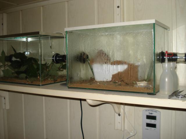 Für die richtige Temperatur und Luftfeuchtigkeit habe ich eine Heizmatte unter eine der beiden Nestkammern gelegt. In jeder Nestkammer befindet sich auch ca. 1kg Sand-Lehm-Gemisch welches das Wasser für die Luftfeuchtigkeit speichert.