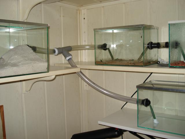 Ich habe, wie auf den Fotos zu erkennen ist, die Anlage um zwei weitere Becken, die noch keine genaue Funktion haben, erweitert. Sie können als Nestkammern oder auch als Abfallkammern genutzt werden. Die Anlage umfasst jetzt insgesamt 7 Becken (1x große Futterkammer, die noch auf keinem der Fotos zu sehen ist, 1x Vorkammer, 1x Abfallkammer und 4 Nestkammern).