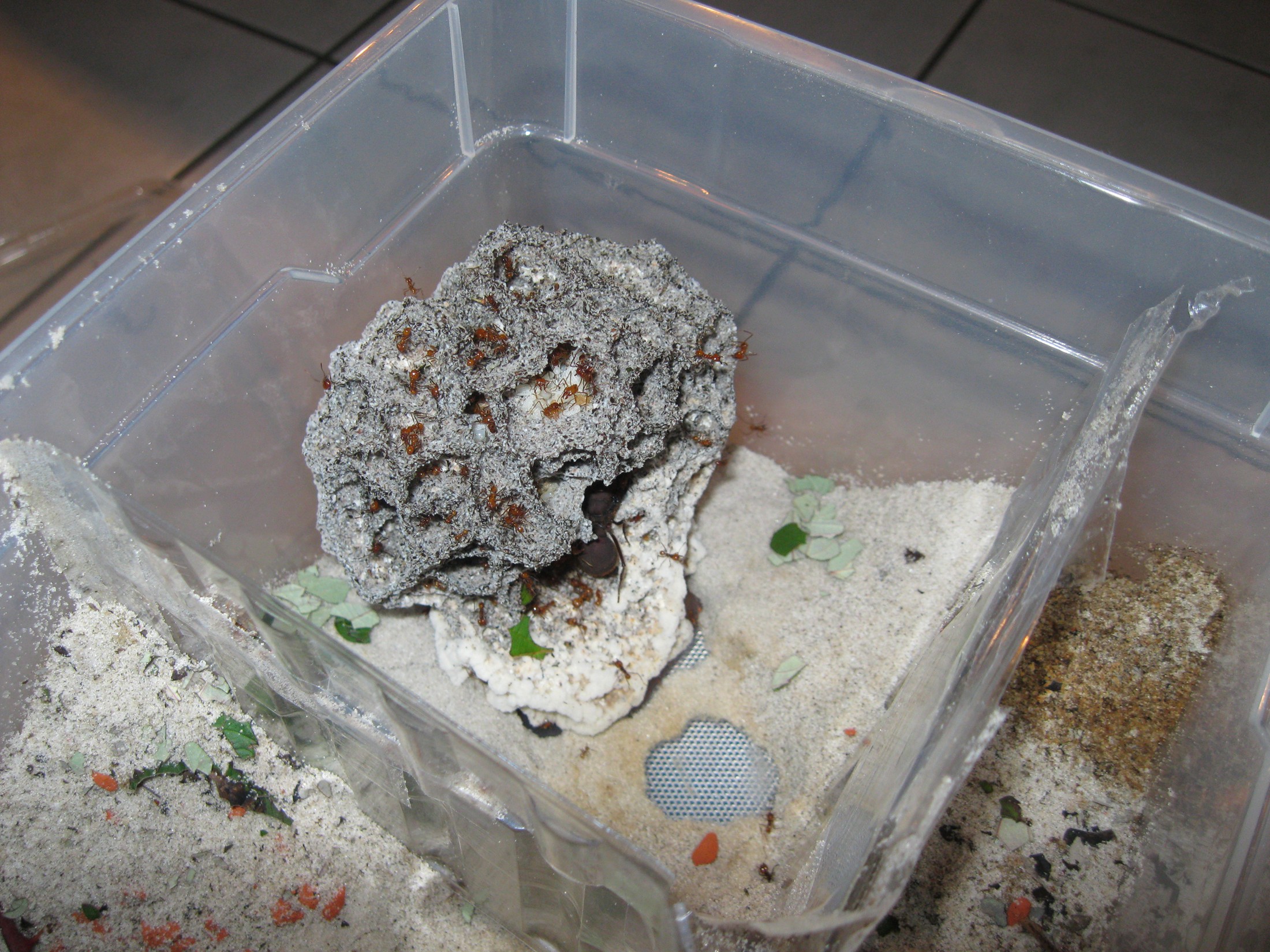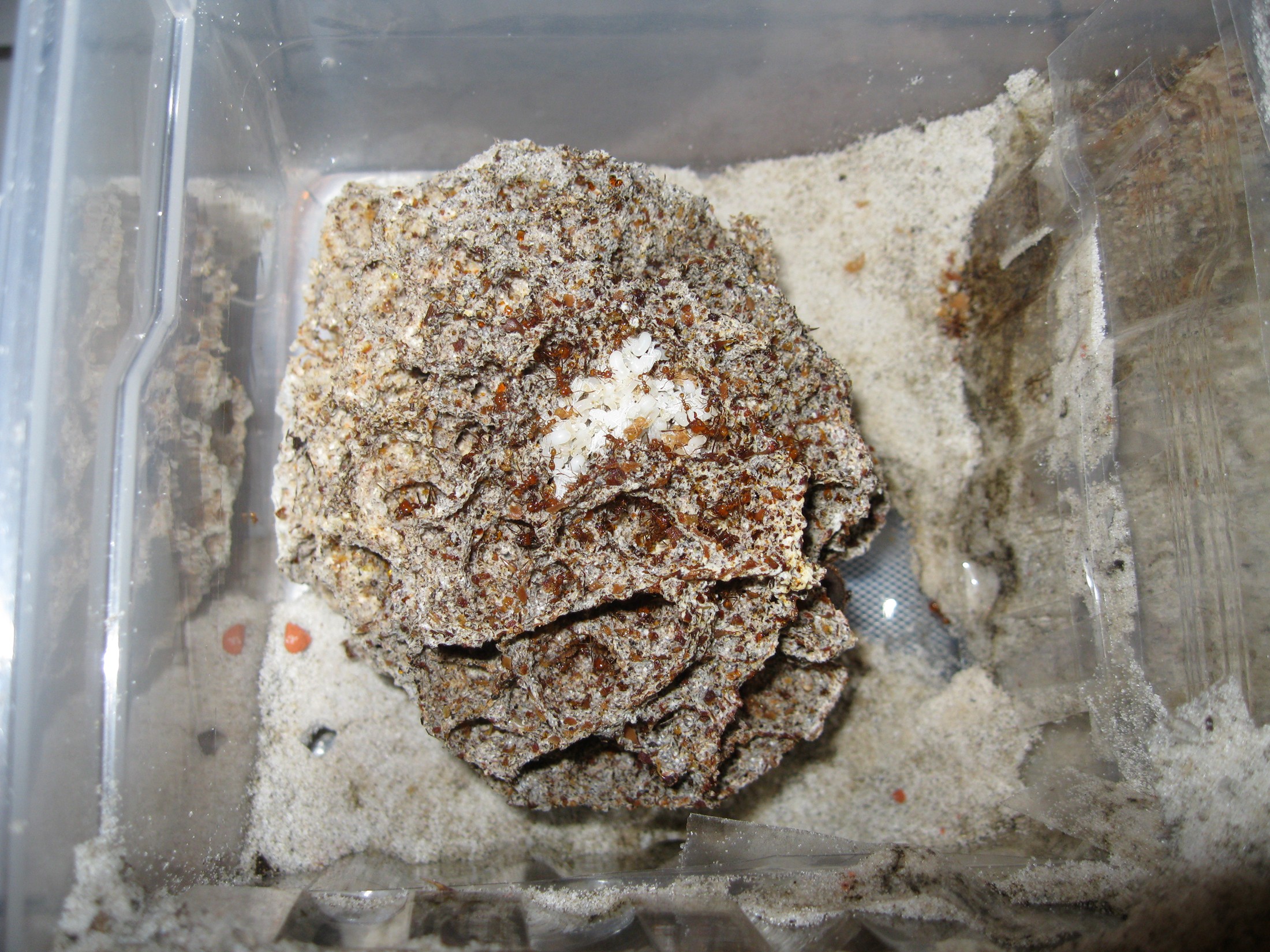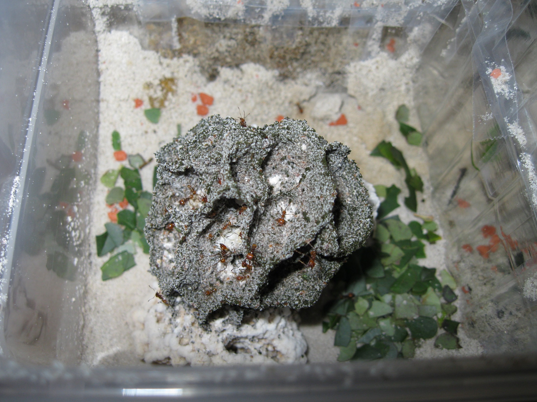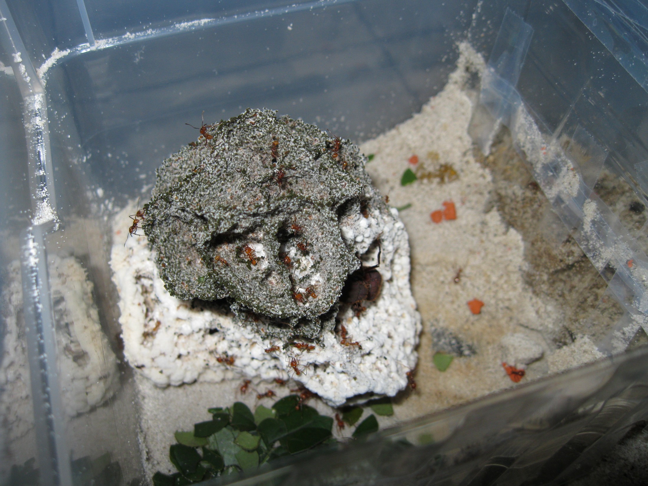 Also die Kolonie wächst kontinuierlich und schnell, so wie ich es von den Blattschneiderameisen gewohnt bin. die Königin ist fast in den Pilz integriert und wird immer mehr mit einbezogen, in die zukünftigen Pilzstrukturen und wird denke ich mal bald von der Bildfläche verschwinden.
