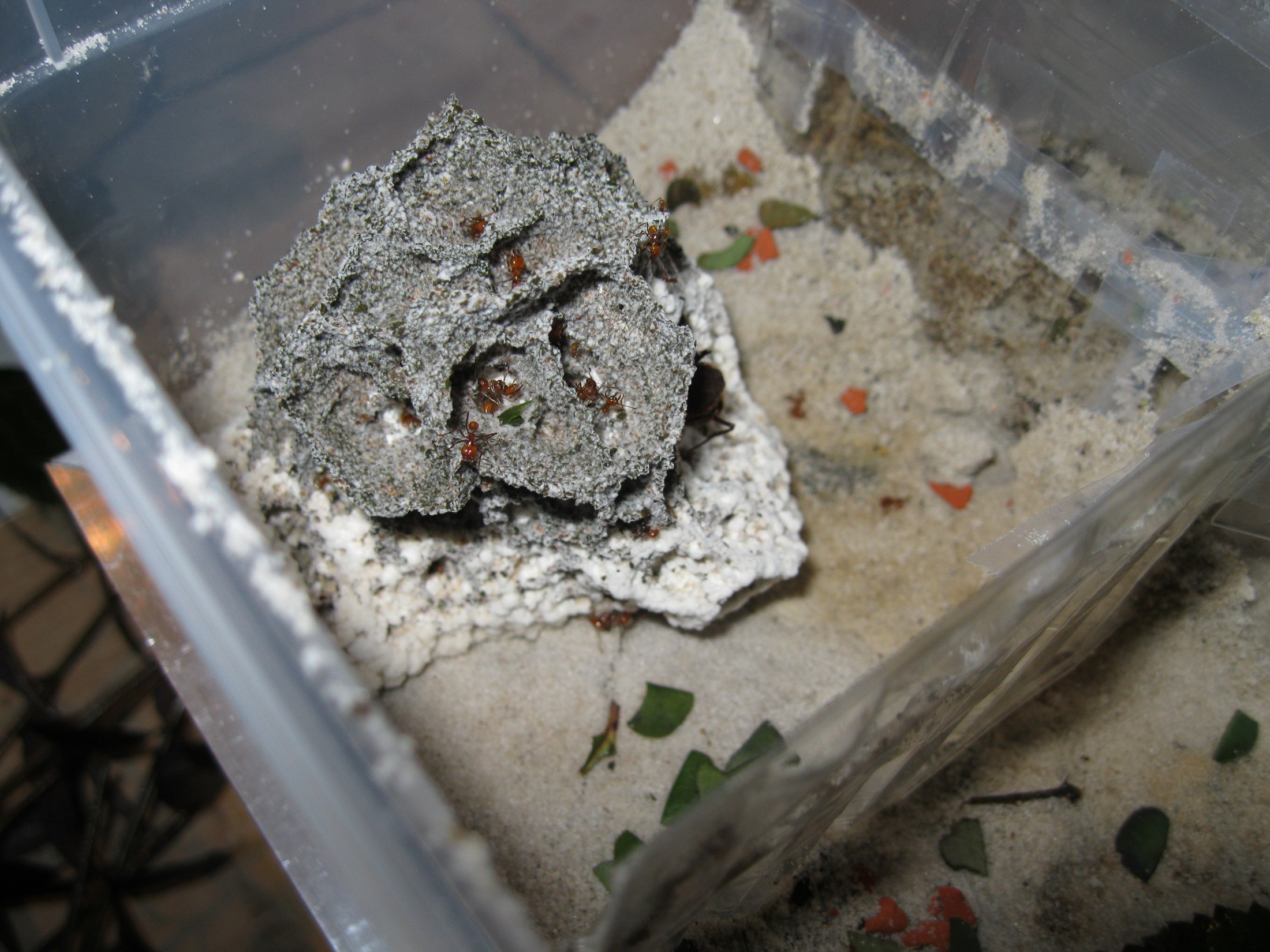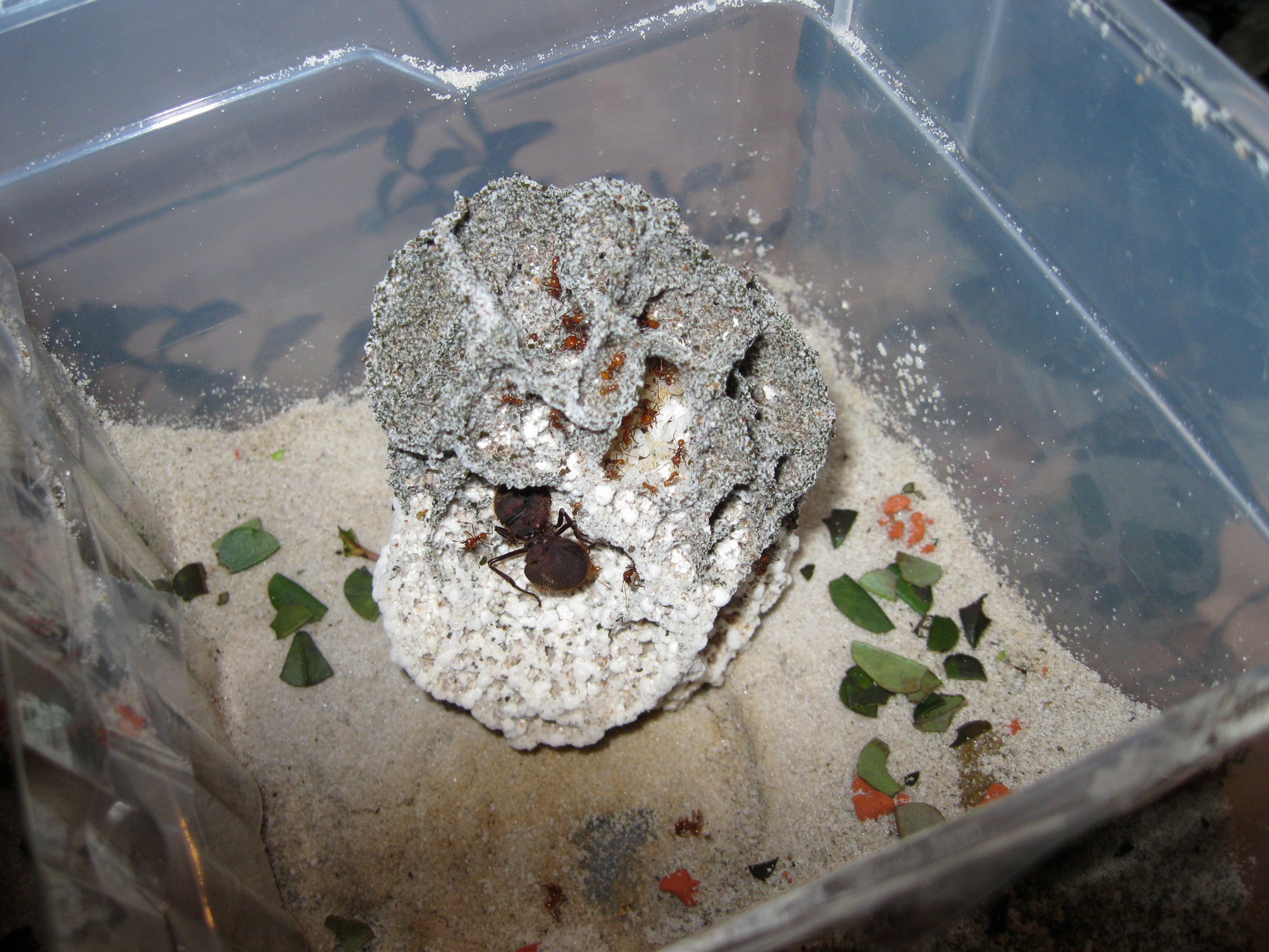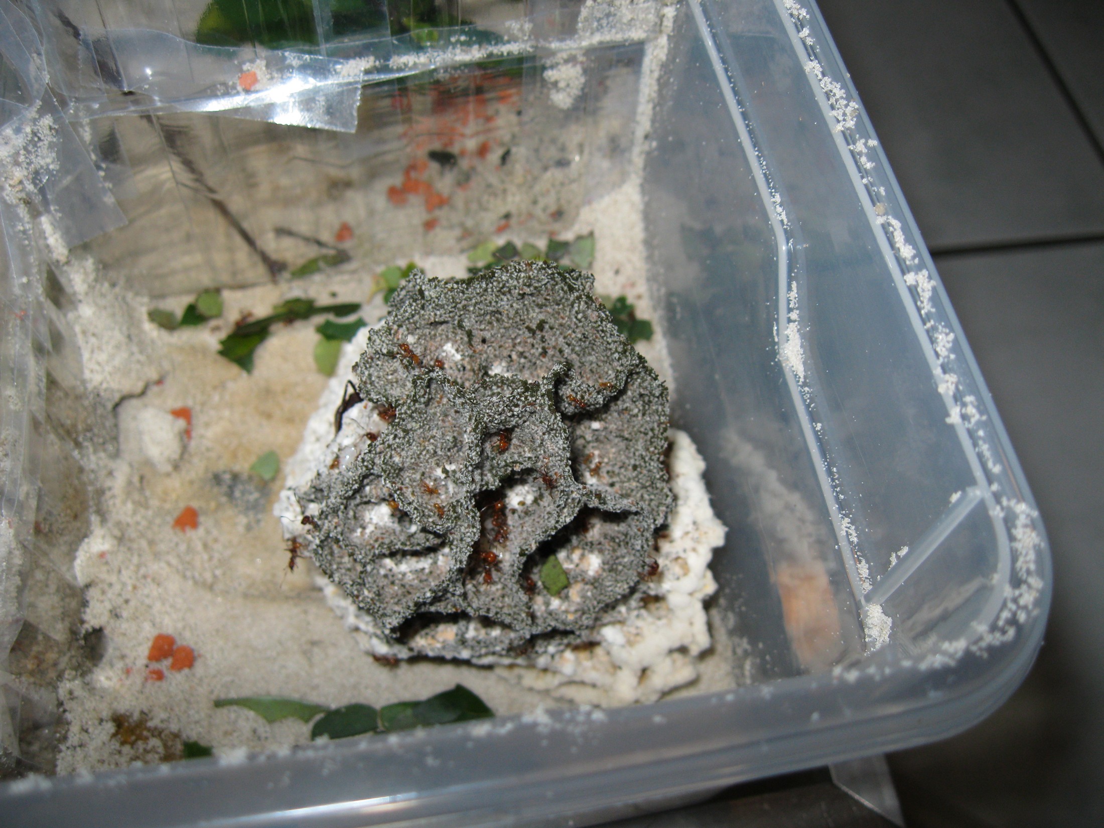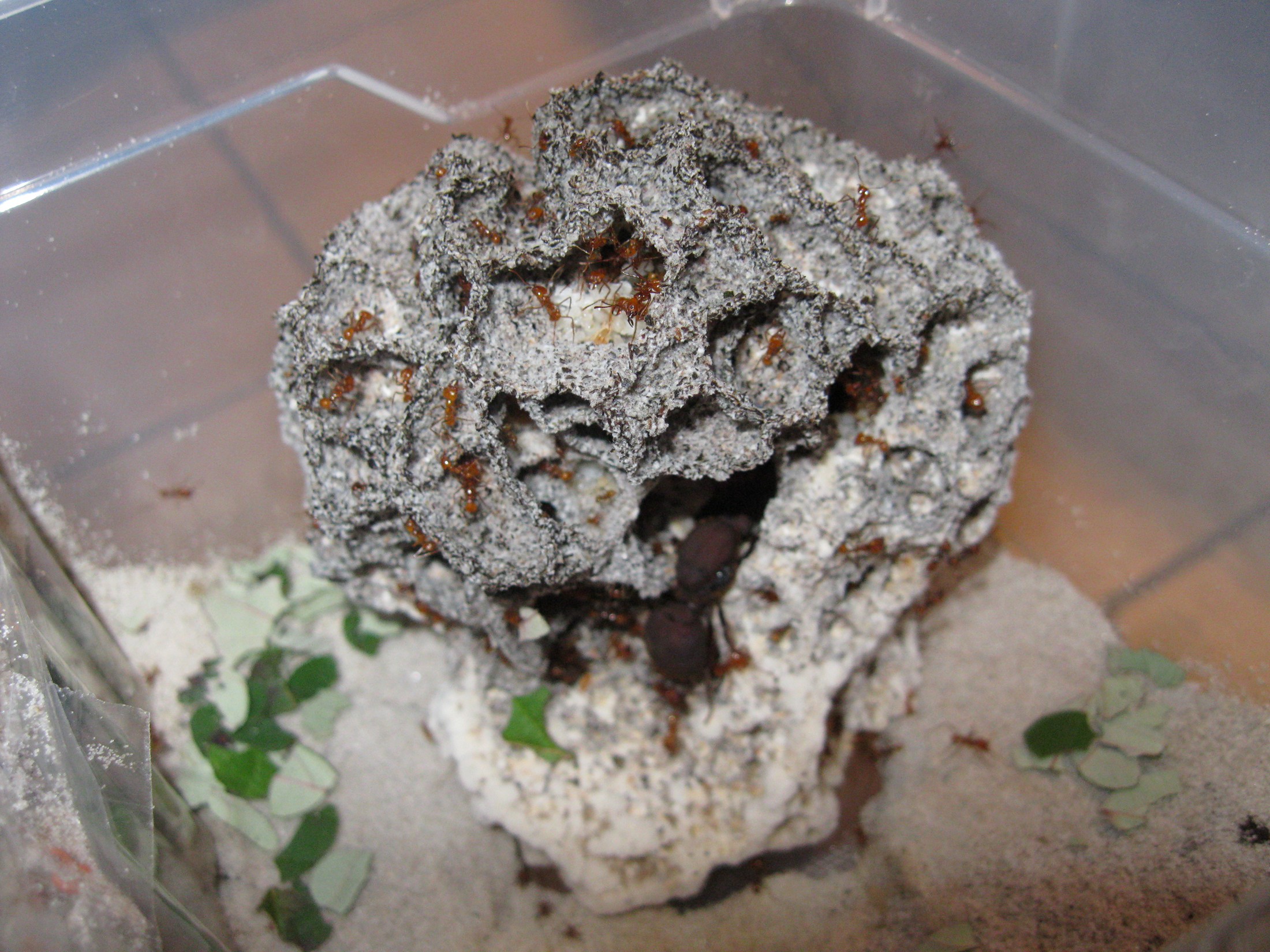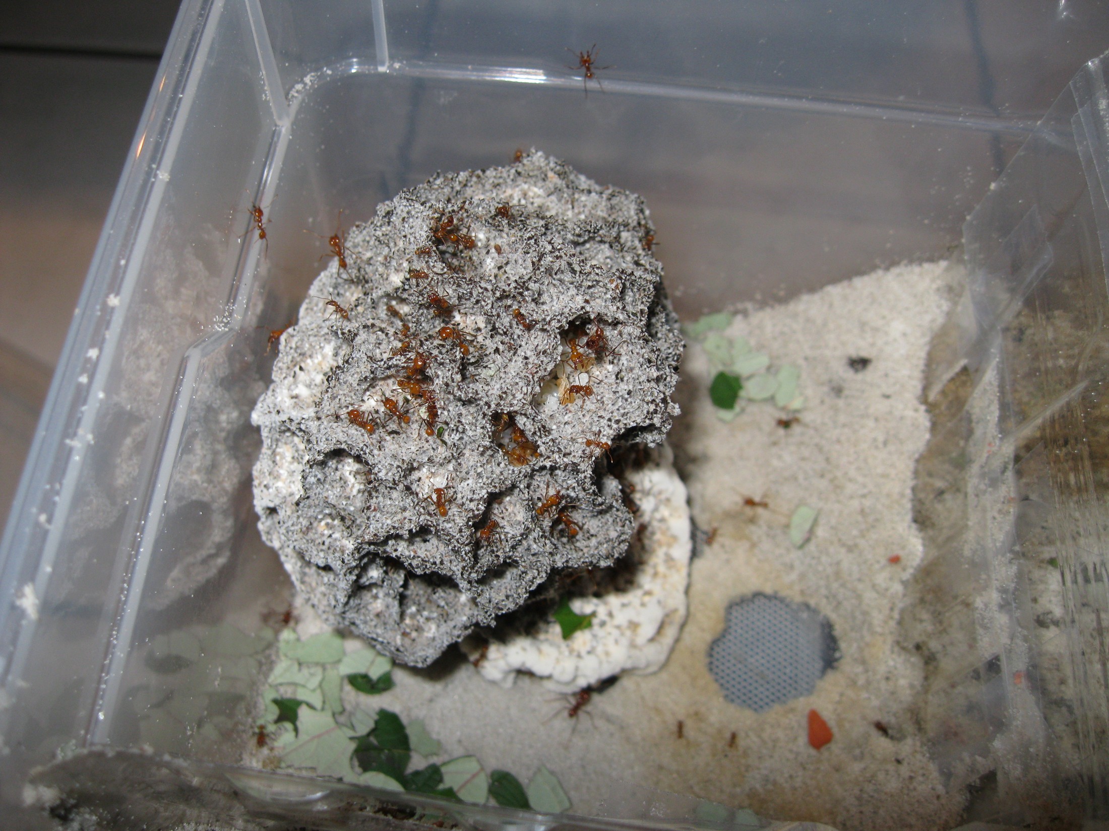 Also die Kolonie wächst kontinuierlich und schnell, so wie ich es von den Blattschneiderameisen gewohnt bin. die Königin ist fast in den Pilz integriert und wird immer mehr mit einbezogen, in die zukünftigen Pilzstrukturen und wird denke ich mal bald von der Bildfläche verschwinden.