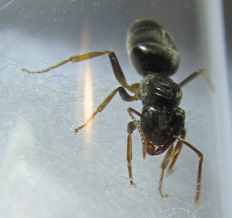 Arbeiterinnen: schwarz, glänzend, Beine werden nach unten hin hellbraun bis gelblich.