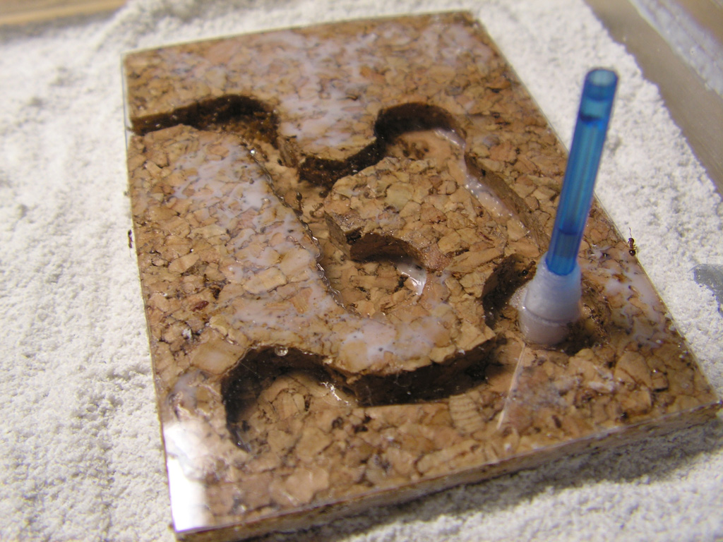 picture of the nest for my temnothorax nylanderi. i made a small hole and used a cotton ear bud with water down the small pipe to give moisture to the nest.