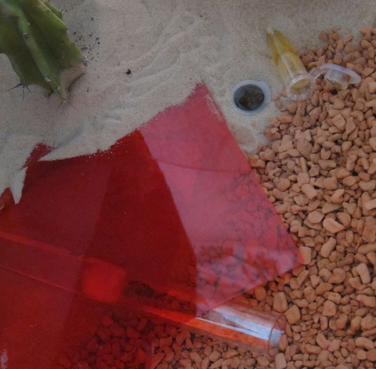 Ich habe meine Arena und Farm wie auf den Fotos zu sehen eingerichtet und danach das Reagenzglas in die Arena gelegt. Die kleine Ampulle in der Arena ist eine Honigprobe und in der Mini-Schale ist Wasser.