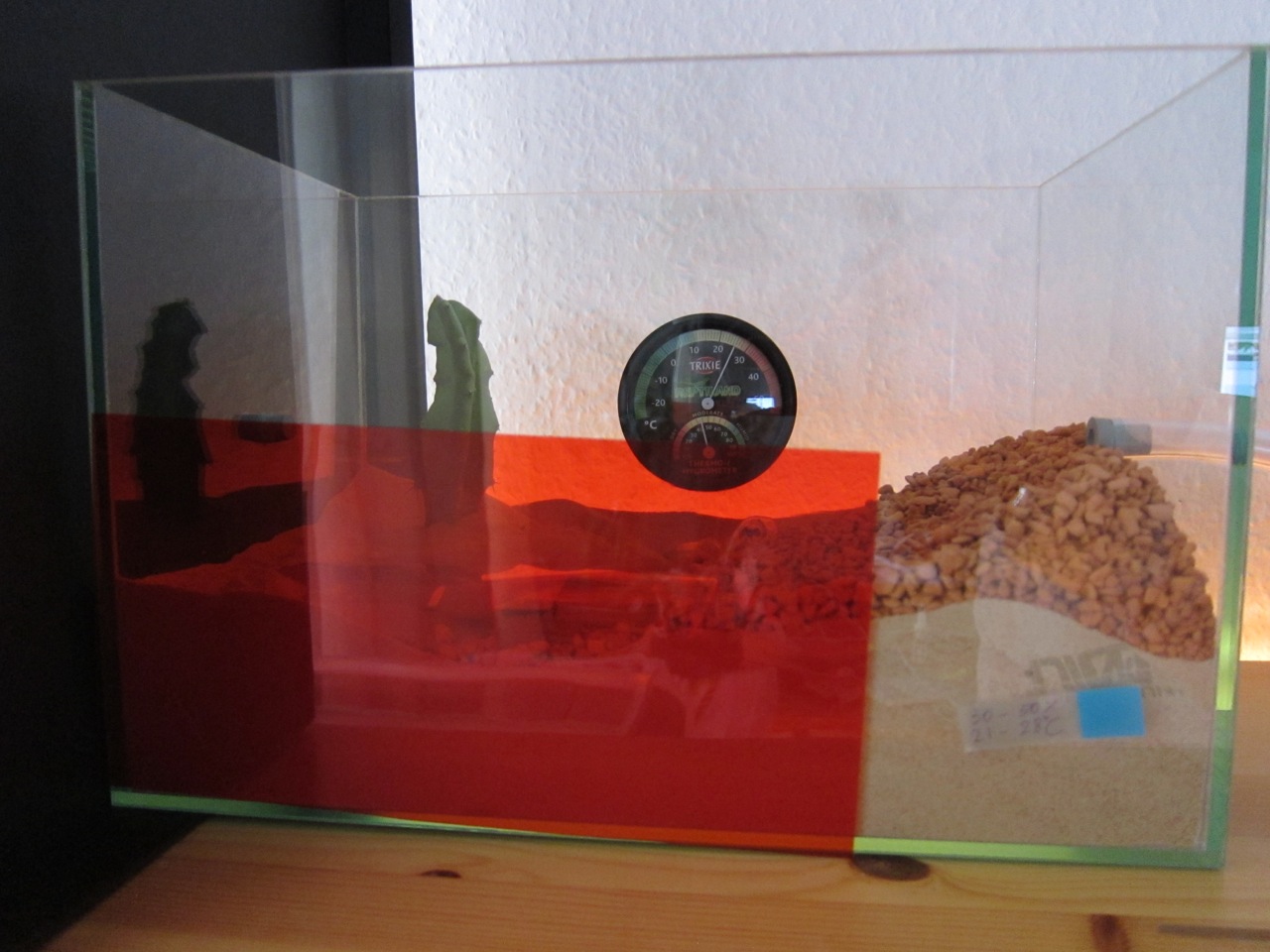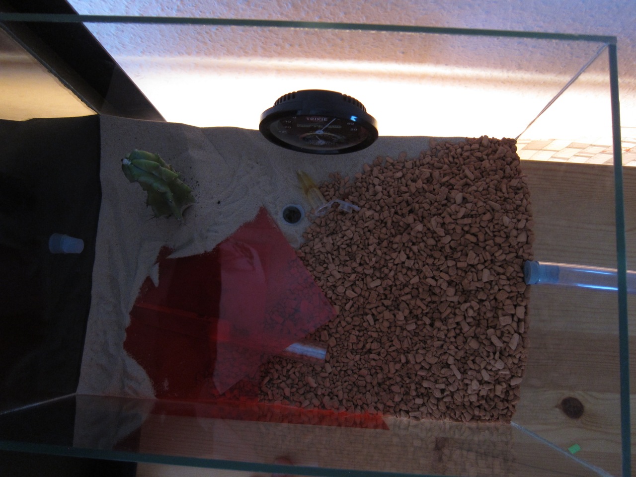 In der Arena geht die Luftfeuchtigkeit bis auf 75% hoch. Ich versuche dann etwas zu lüften, aber kann das natürlich auch nicht andauernd machen. Optimal wären für die Cruentatus ja wohl 30-50%. Ich habe außer der Wasserschale mit 1ml Trinkwasser keine Feuchtigkeit hinzugefügt.