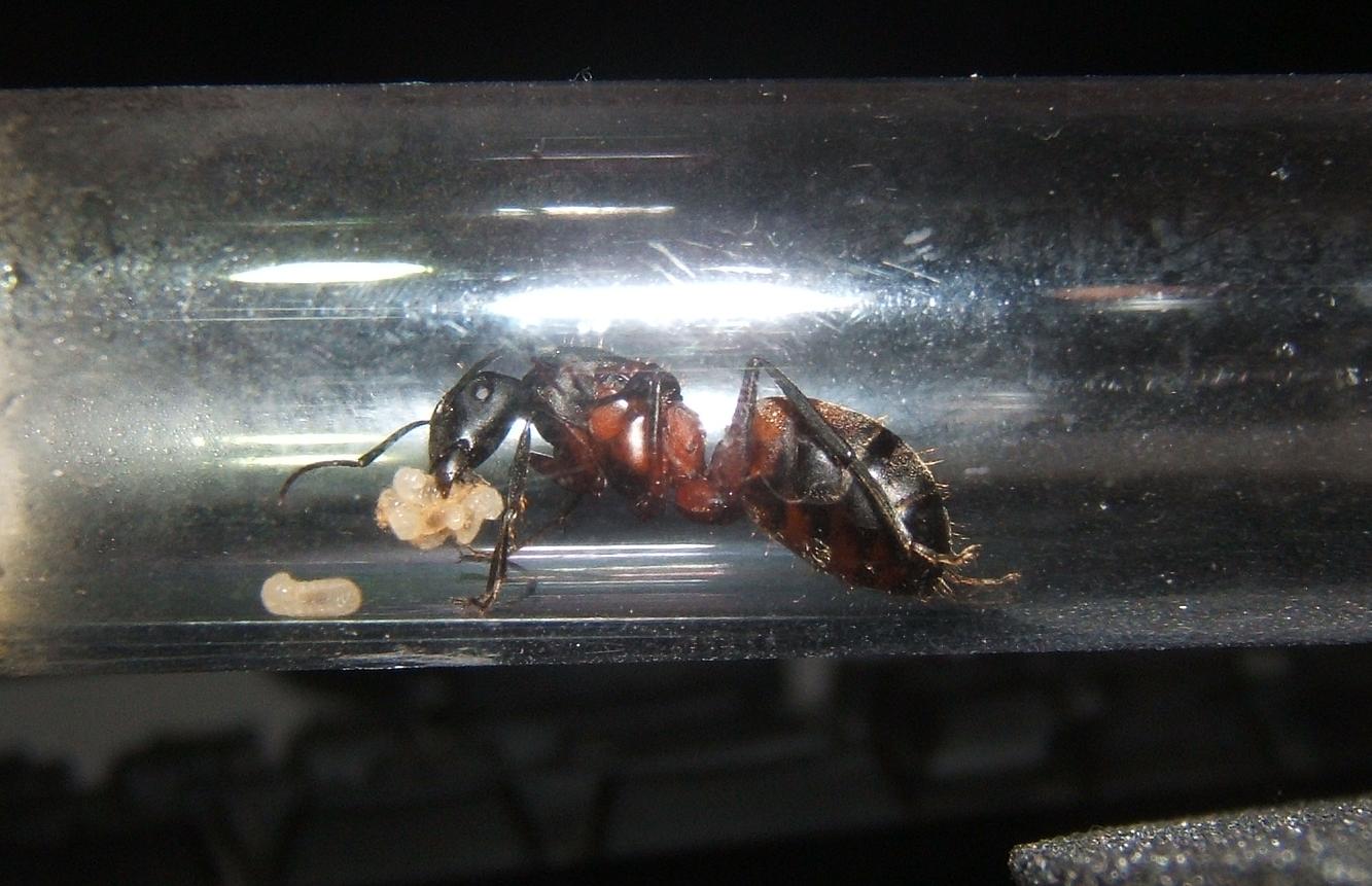 Zuvor saß die Gyne, selbst wenn ich die Alufolienabdeckung abnahm, immer ruhig im Reagenzglas und hütete ihre Brut. Da Camponotus cruentatus meines Wissens nach claustral gründet,