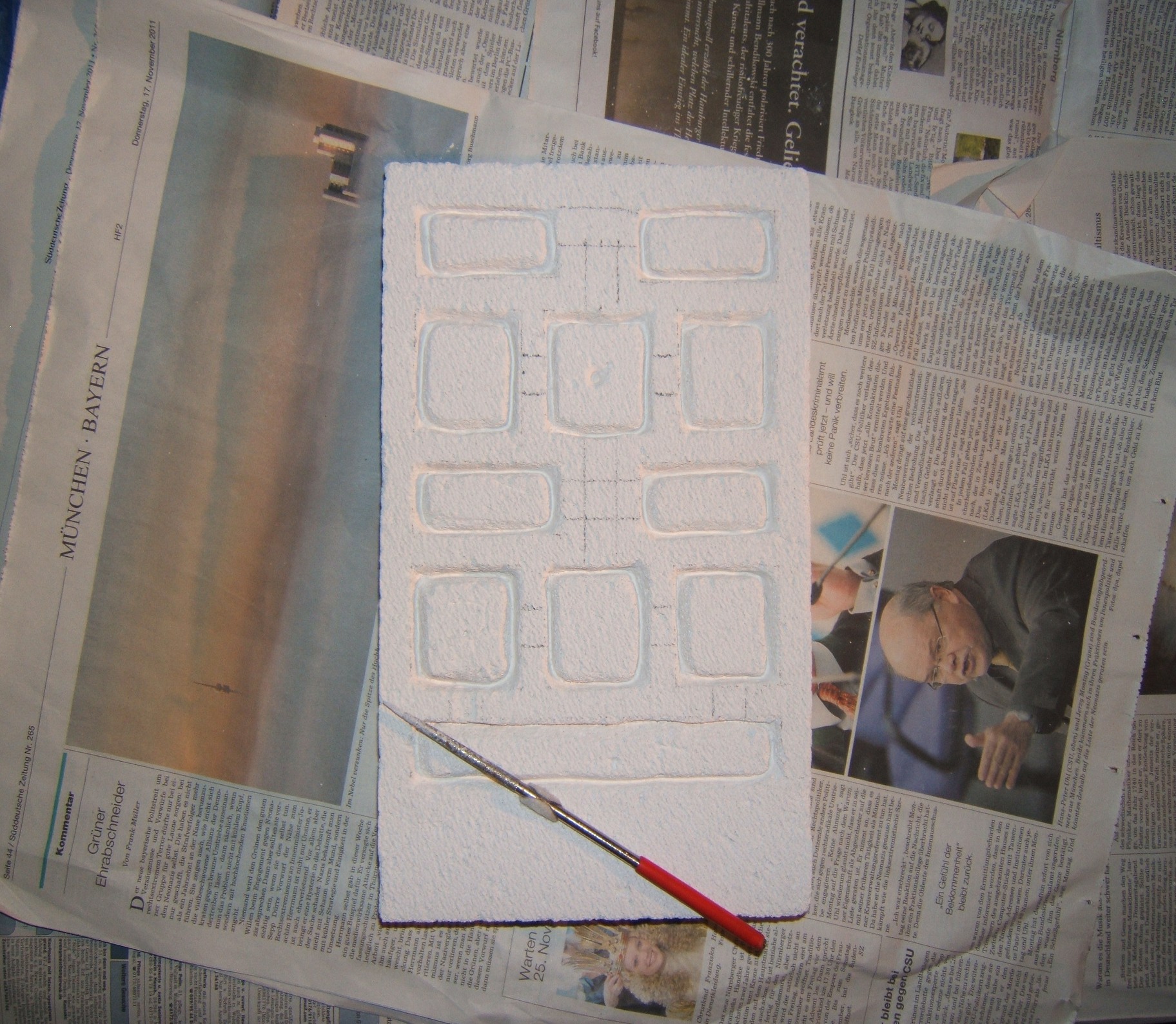 Ich habe meinen Schreibtisch mit Zeitungspapier ausgelegt und einen Staubsauger bereit gestellt, welcher sich als sehr wichtiges Instrument in diesem