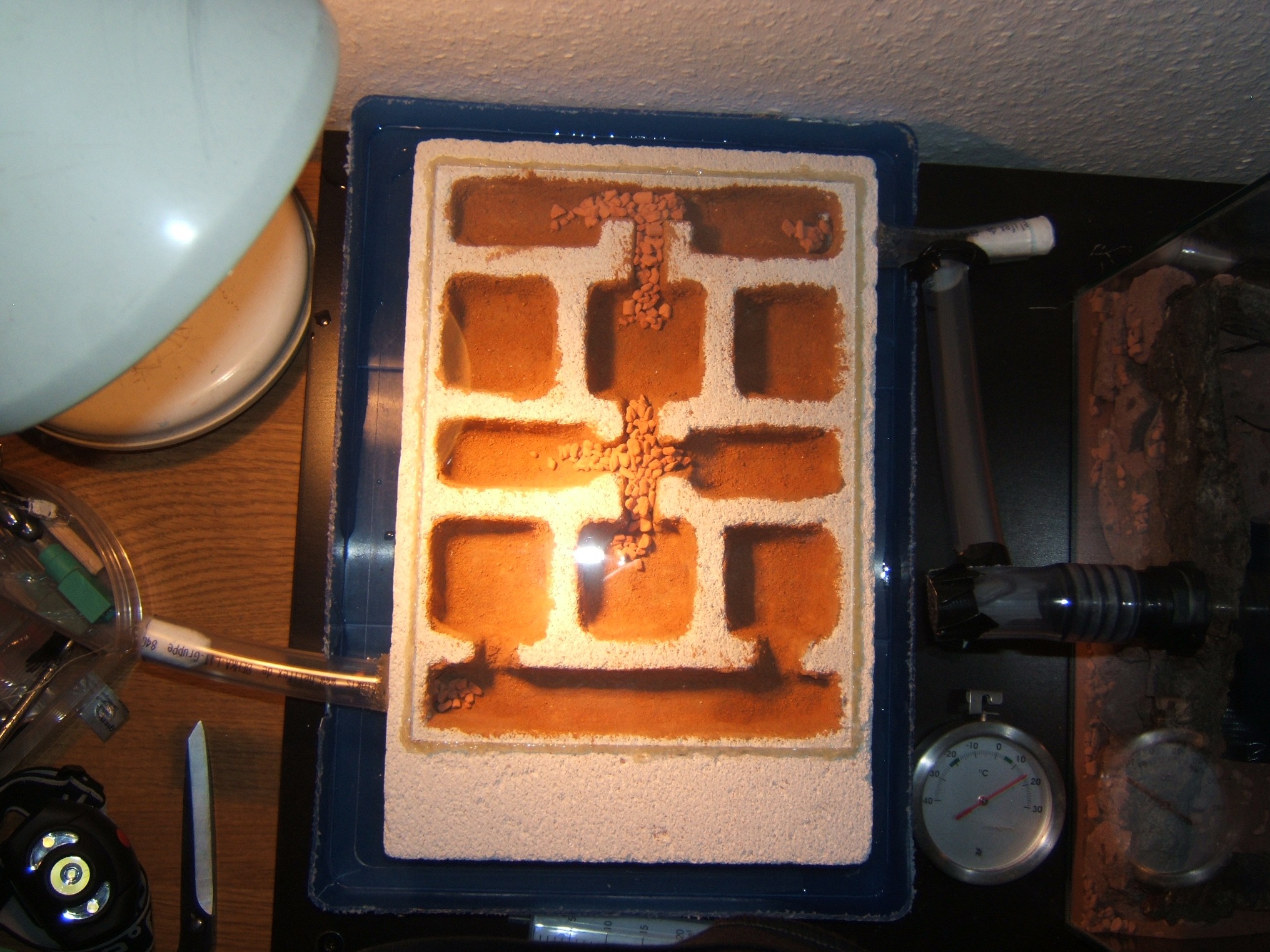 Nach dem der Sand getrocknet war, hab ich die kammerseparierenden Gänge mit Seramis aufgefüllt. Ich hielt es für wichtig, dass der Seramis nicht zu fest sitzt, sondern