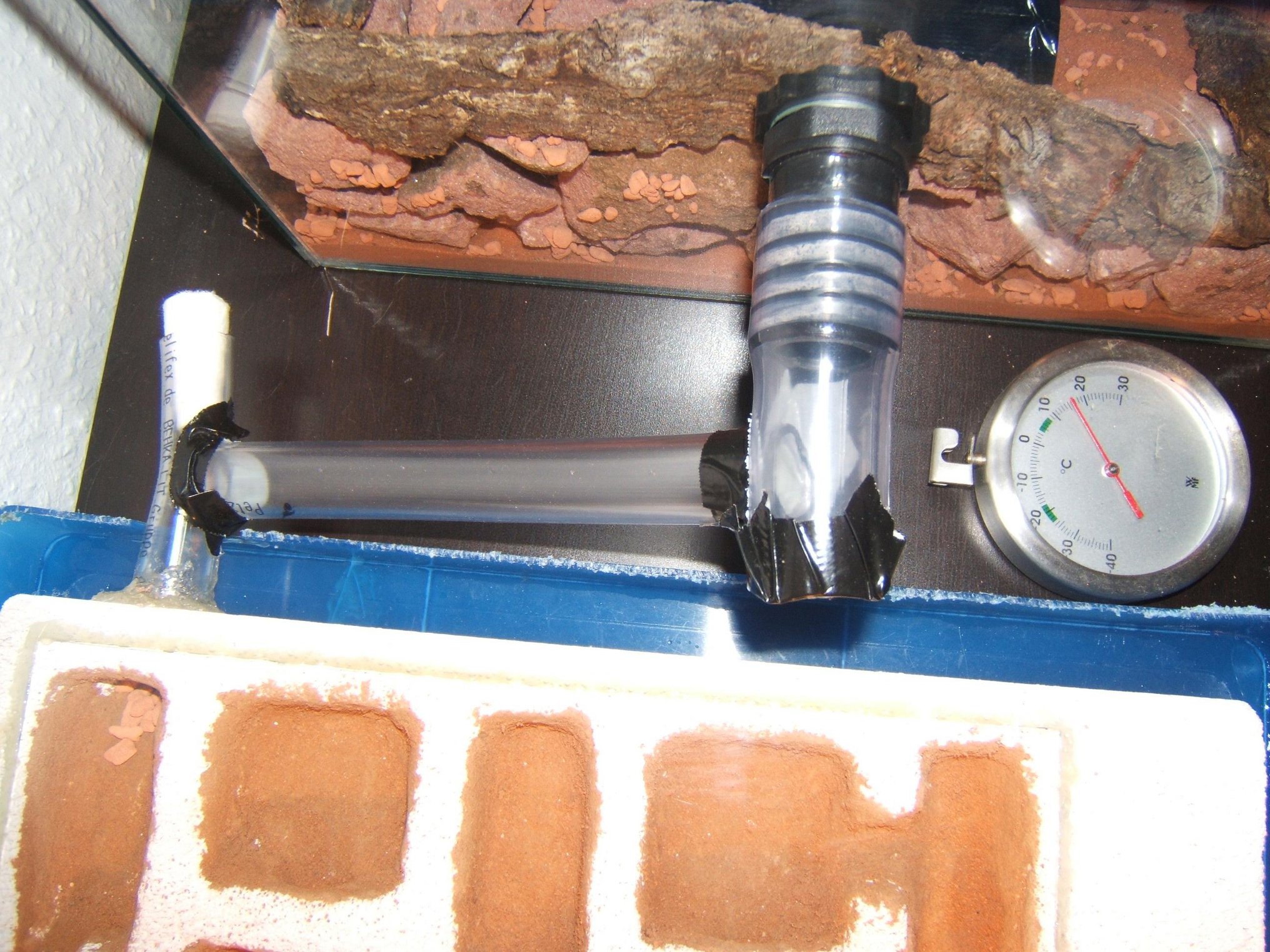 (was auch nötigen bei den Temperaturen in den letzten Wochen war). Tagsüber erwärmt eine kleine Tischlampe den Bereich um das Reagenzglas (ca. 25-27°C).