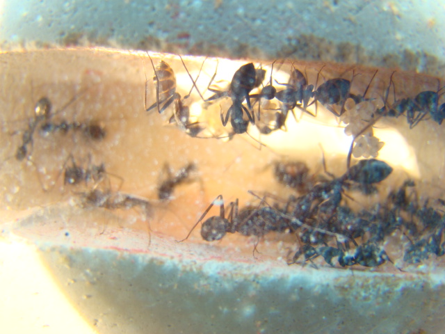 darradar hat geschrieben::jump: yippe so they arrived today, and wow they really are pretty ants, not like our native's at all, quite delecate actaully, there are 8 workers, and about 4 eggs with the queen in the tube, they seem very active considering their long journey.
