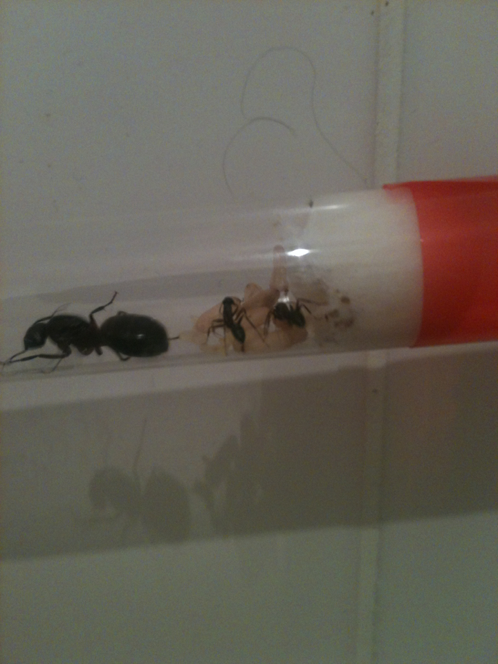 Ich habe am 16.6 2 Gynen gefunden von 2 Camponotus herculeanus. Und heute 7.8 sind je 2 und einmal 1 Arbeiterin geschlüpft. Sie leben noch in einem Röhrchen und sind dann bereit für die Arena. Ich pflege noch Lasius niger wo ich eine Kolonie mit ca 65 Tieren habe und eine, die noch auf ihren Eiern sitzt und wartet bis sie schlüpfen. Bei der dauert es noch ca 2 Wochen. Am Bild kann man gut erkennen den Größenunterschied der Eier. Nahrung und Brut. Am nächsten Bild sieht man die ersten 2 Arbeiterinnen. Die Gründung kann beginnen :-) Heute ist bei uns Königinnentag!