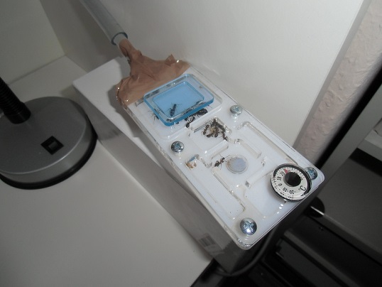 bei mir hat übrigens eine einfache schreibtischlampe als wärmespender super fuktioniert. sie fahren total auf wärme ab!!! egal, wohin ich den lichtstrahl richtete, sofort fingen die arbeiterinnen an, die eier zur "heißesten" stelle zu schleppen und sich ein nest einzurichten. nachdem die eier transportiert waren, wurde auch die königin dorthin verfrachtet. ich konnte mir quasi den ort für das nächste nest allein durch den lichtstrahl meiner schreibtischlampe auswählen. ganz klar: nie zu oft, denn der stress für die königin muss enorm sein,,,, ich habe am thermometer immer beobachtet, dass der neue nestort nicht zu heiß wurde. so habe ich sie schnell aus dem reagenzglas locken können. sie lebten eine lange zeit im schlauch. die rote folie, die ich um den schlauch band, wollten sie nicht. ihnen war der helle strahl der lampe 1000mal lieber.