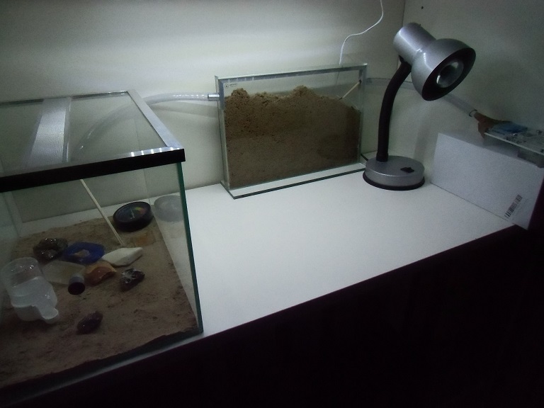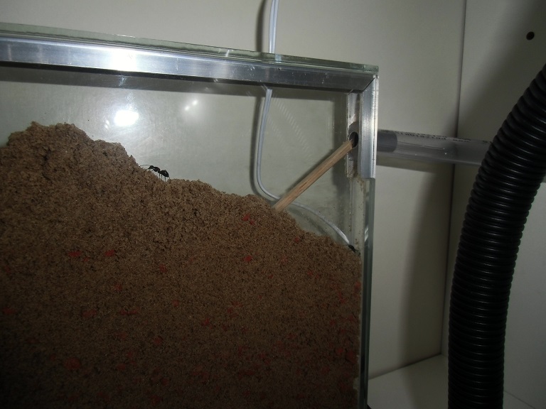 in der vorletzten woche habe ich mir vom antstore dann das hier gekauft: AM Formicarium Acryl 13x6 mit Tank. die gänge sind zwar etwas eng, aber mit ein bisschen bastelei habe ich den schlauch mit dem teil verbinden können. die königin passt in den haupteingang, durch die gänge kann sie sich durch ihr hinterteil nicht quetschen, aber alle scheinen sich sehr wohl zu fühlen. es gibt dazu einen kleinen wassertank, sodass auch die nötige feuchtigkeit da ist.